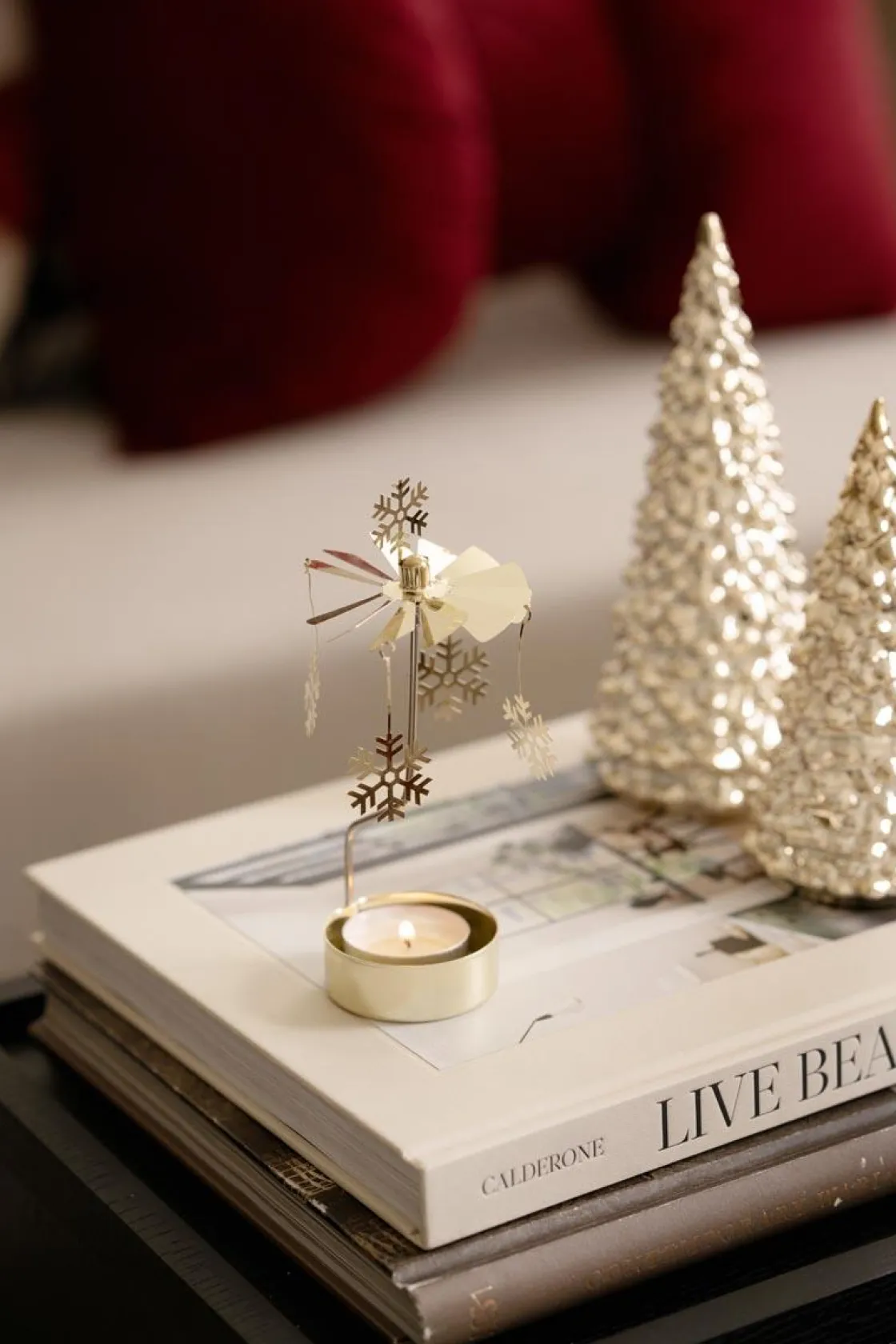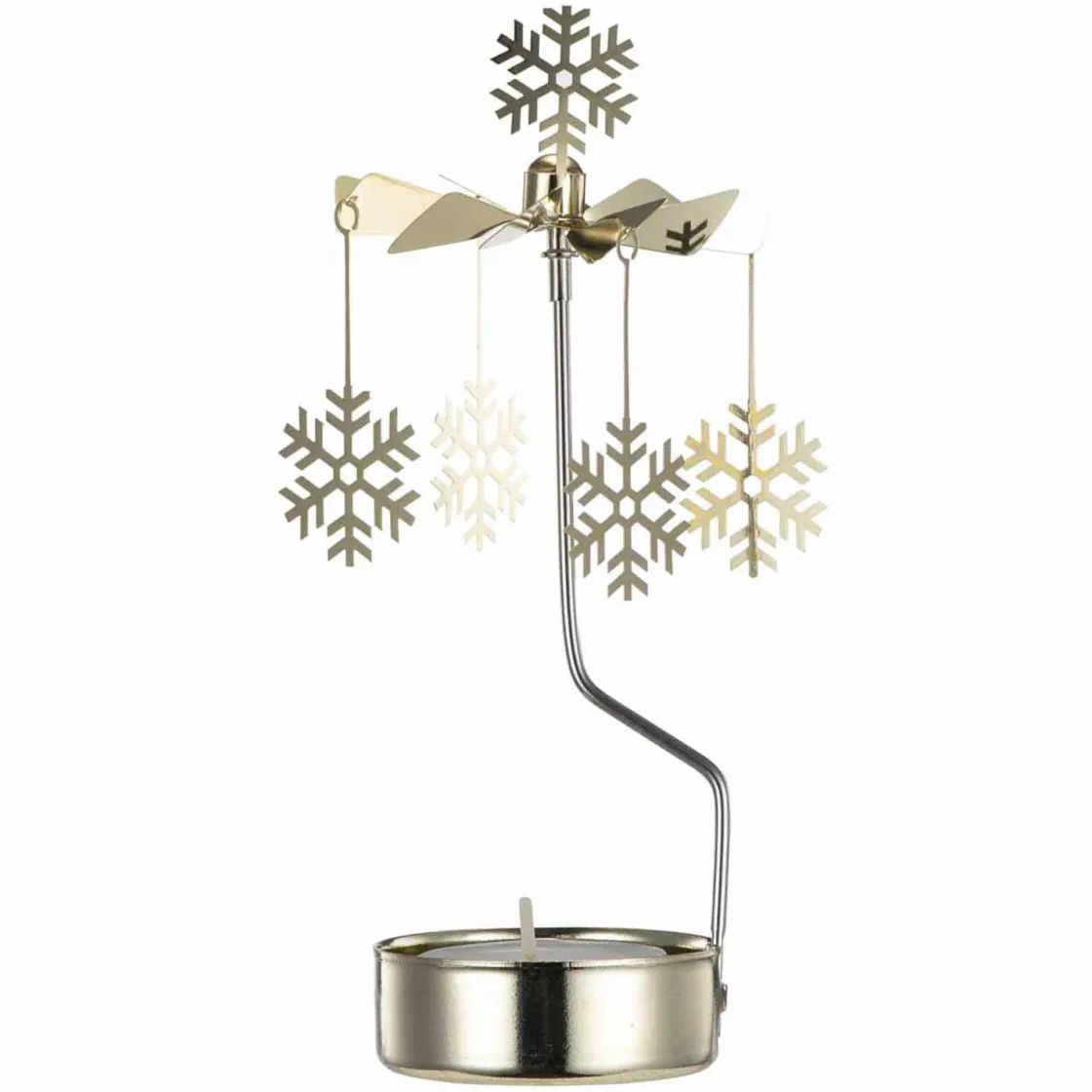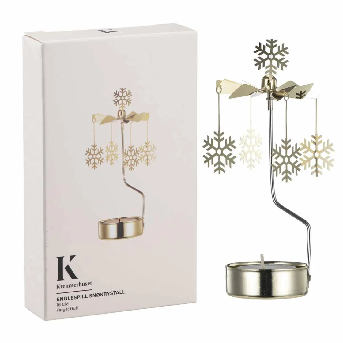 Nydelig englespill i gullfarget metall. Tenn telyset og se snøflakene danse rundt og rundt. Plasser på og pynt klart til jul med herlig julepynt og dekorasjoner.
