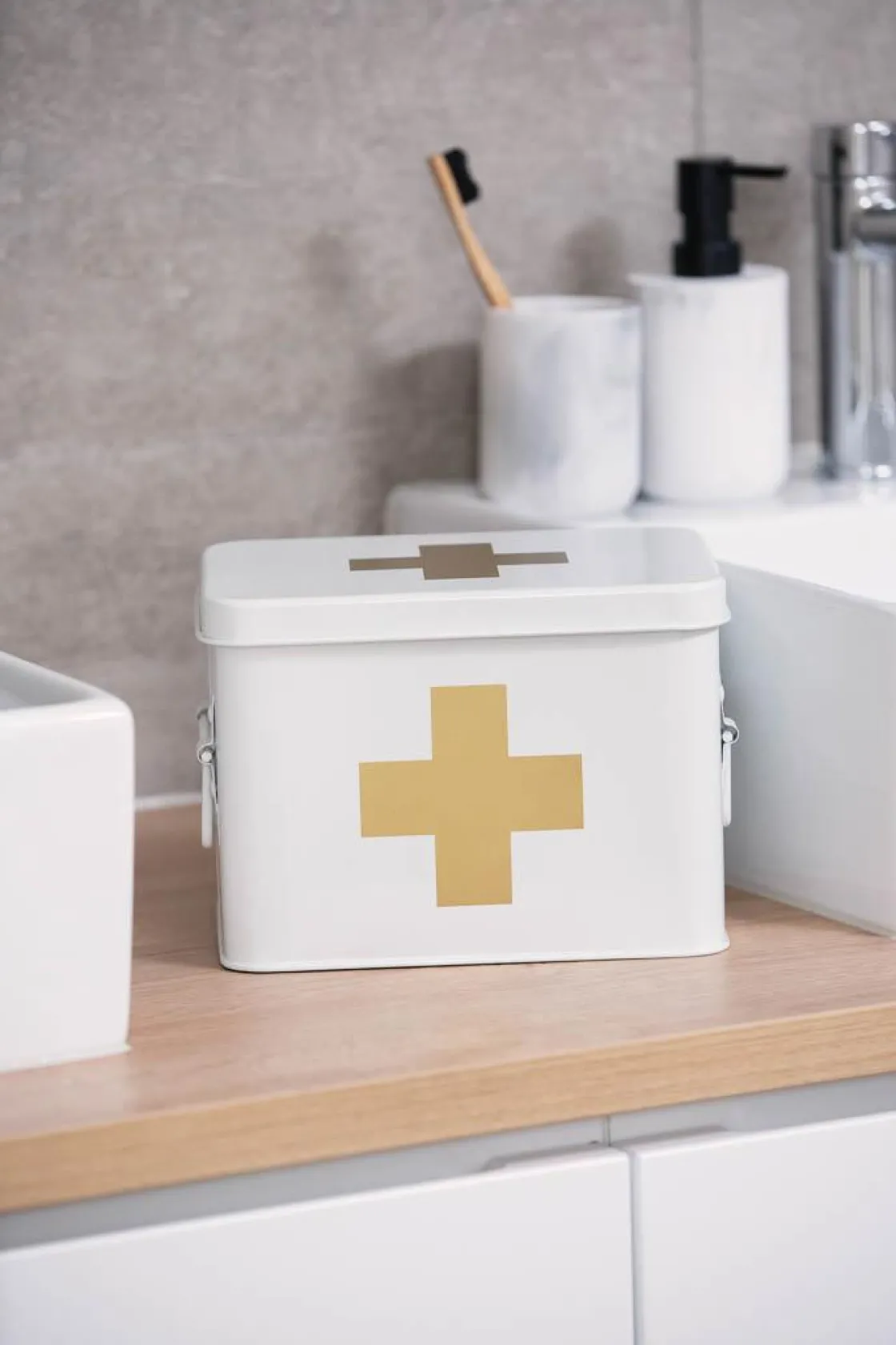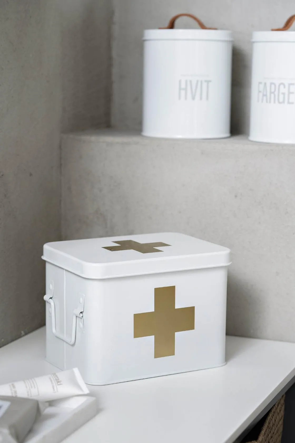 Når skaden skjer, er det viktig å vite hvor du har samlet elementære plaster, saks bandasjer og liknende. Boksen har en bunn inndelt i tre rom, og en beholder oppå som kan tas ut. Boksen er av stål, og tåler å stå i fuktige rom.
