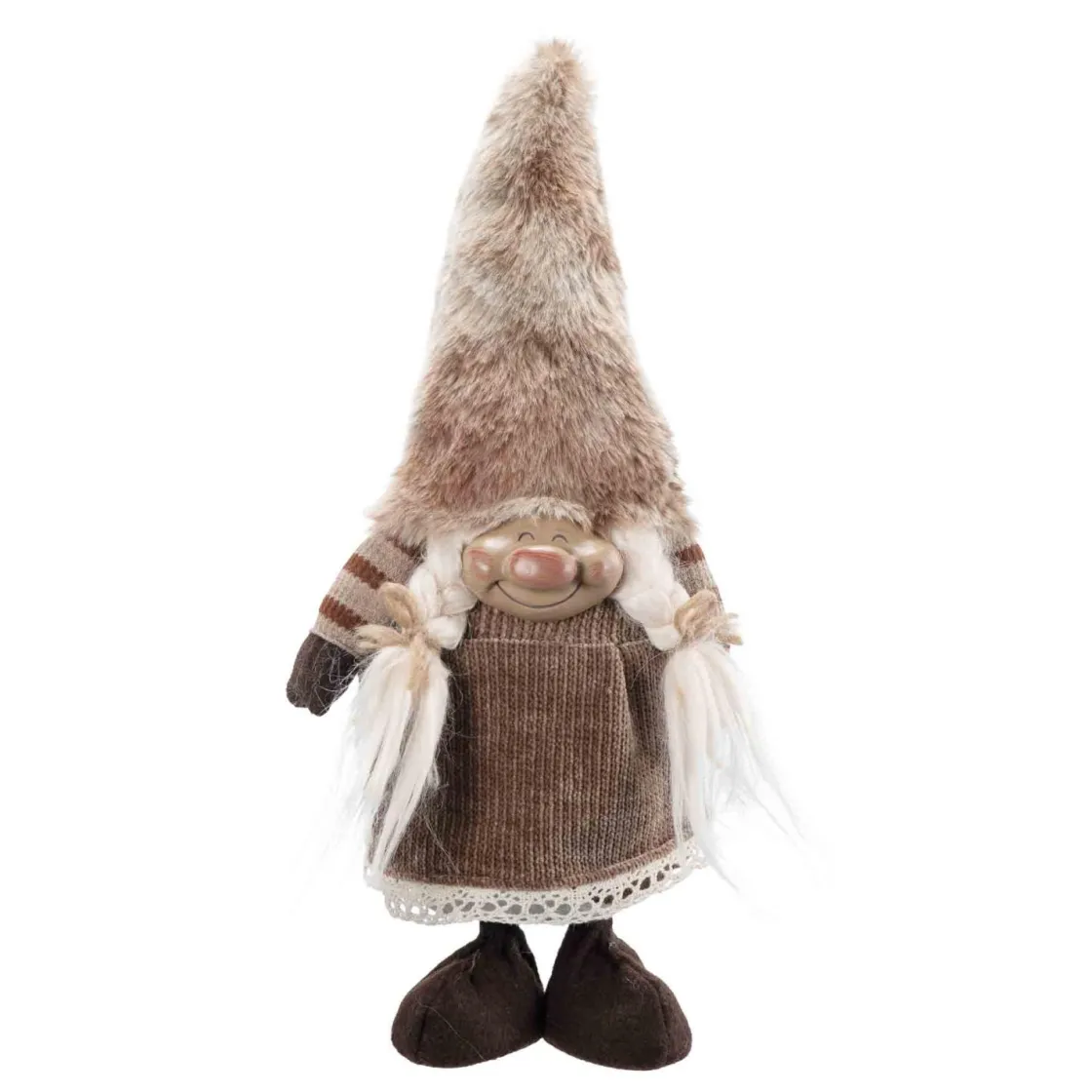 Oppdag vår koselige gnomdame med fletter. Denne sjarmerende figuren er perfekt for å bringe varme og glede til ditt hjem i juletiden.