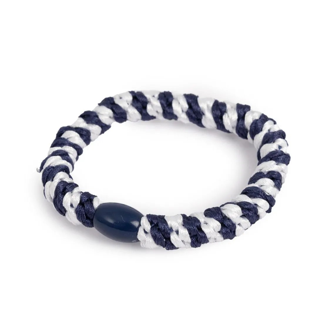Hårstrikken i marine og hvit, gir en klassisk og stilren touch til enhver frisyre. Designet er både elegant og funksjonelt, og holder håret på plass uten å skape unødvendig stress på håret.