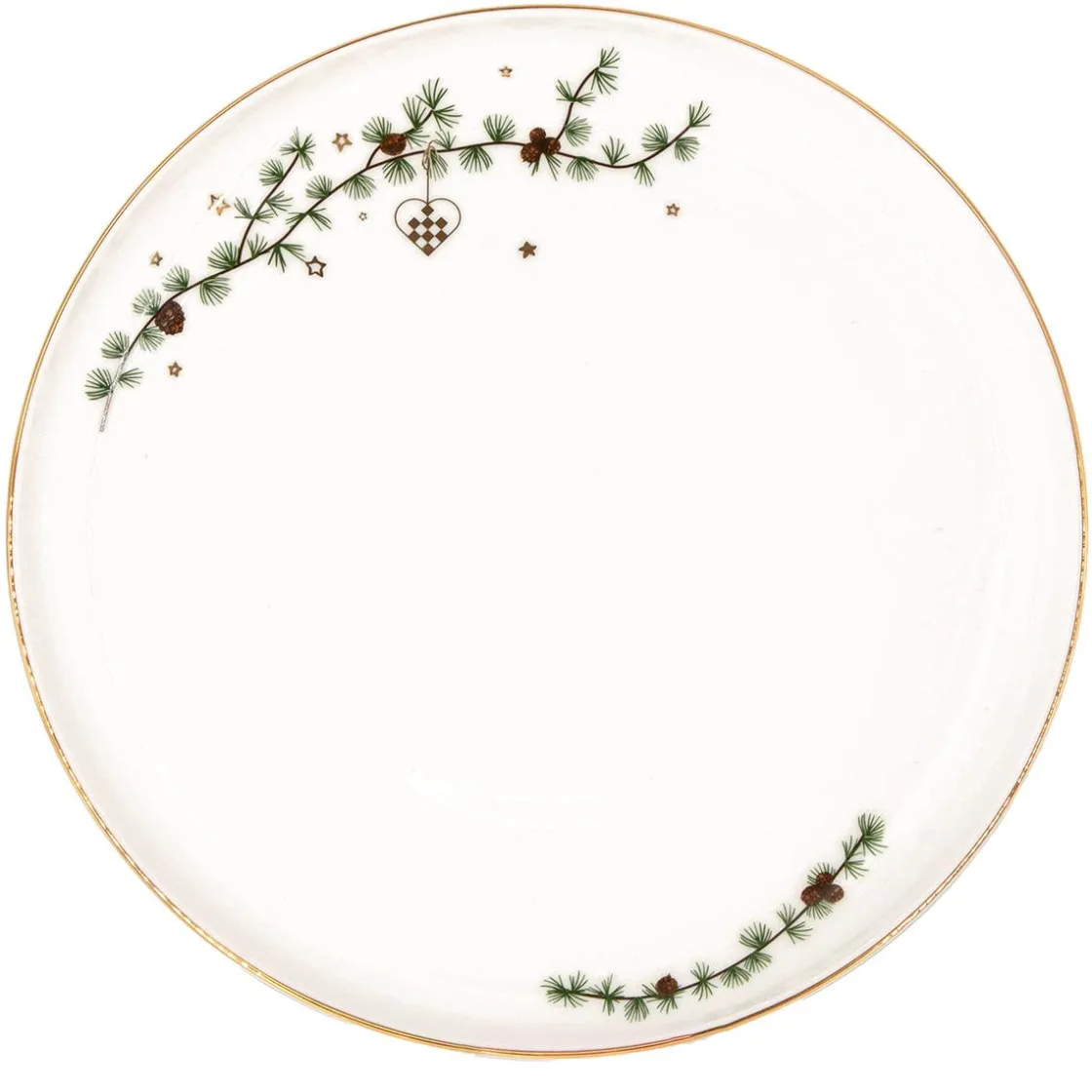 Elegant middagstallerken med klassisk julemotiv i grønt, gull og brunt. De fine detaljene med kongler, stjerner og julehjerte gir en varm og tradisjonell stemning til julemåltidet. Match gjerne med resten av serviset for en helhetlig borddekking.