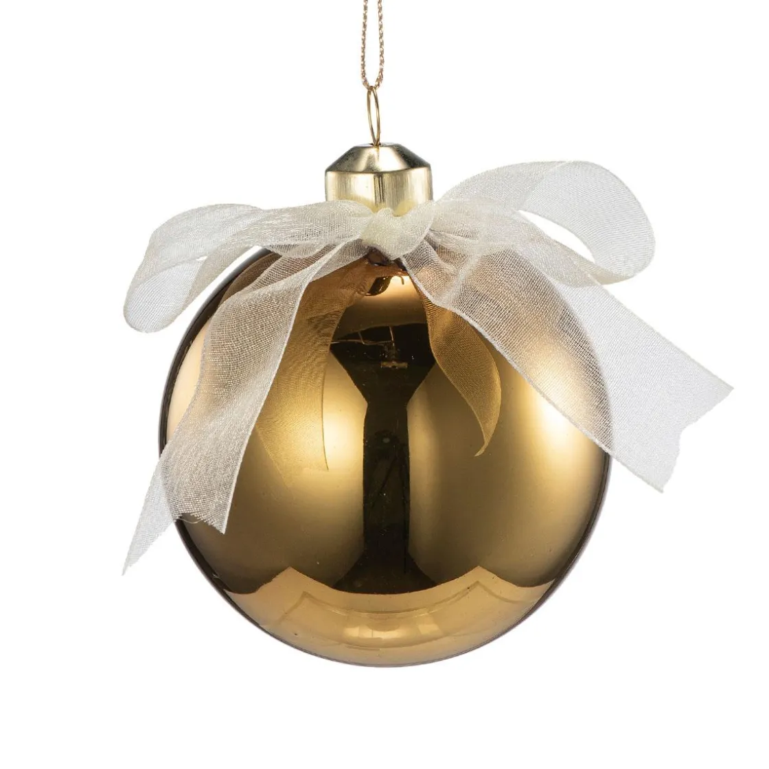 En enkel og elegant julekule i gull med dekorativ sløyfe i lys tekstil. Den blanke overflaten reflekterer lyset vakkert og gir juletreet et klassisk uttrykk. Passer perfekt sammen med våre andre i gull og hvitt for en harmonisk julepynting.