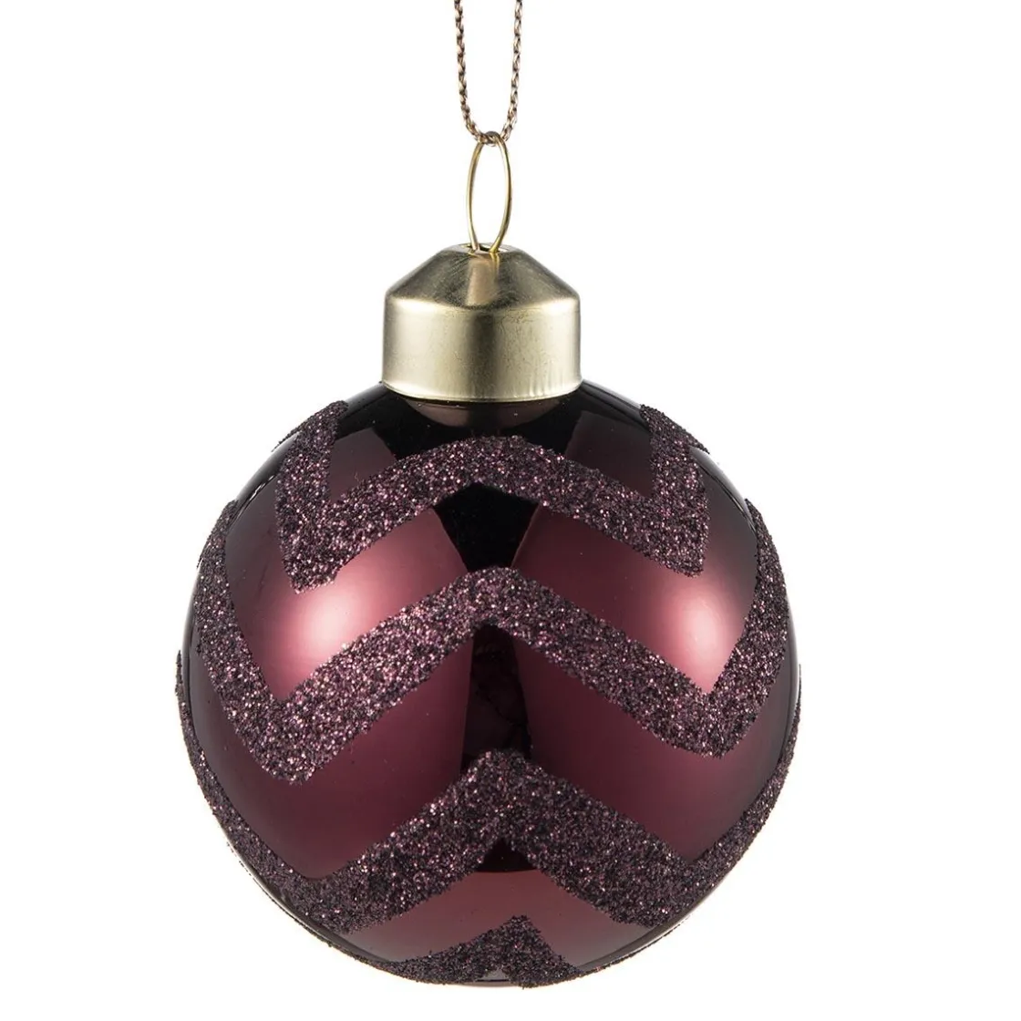 Nydelig burgunder julekule med glitterstriper. Morsomt og lekent mønster som passer perfekt på juletreet denne julen. Frisk opp og pynt et tre som gjenspeiler din smak og personlighet. Kombiner gjerne med julekuler i gull eller grønn.
