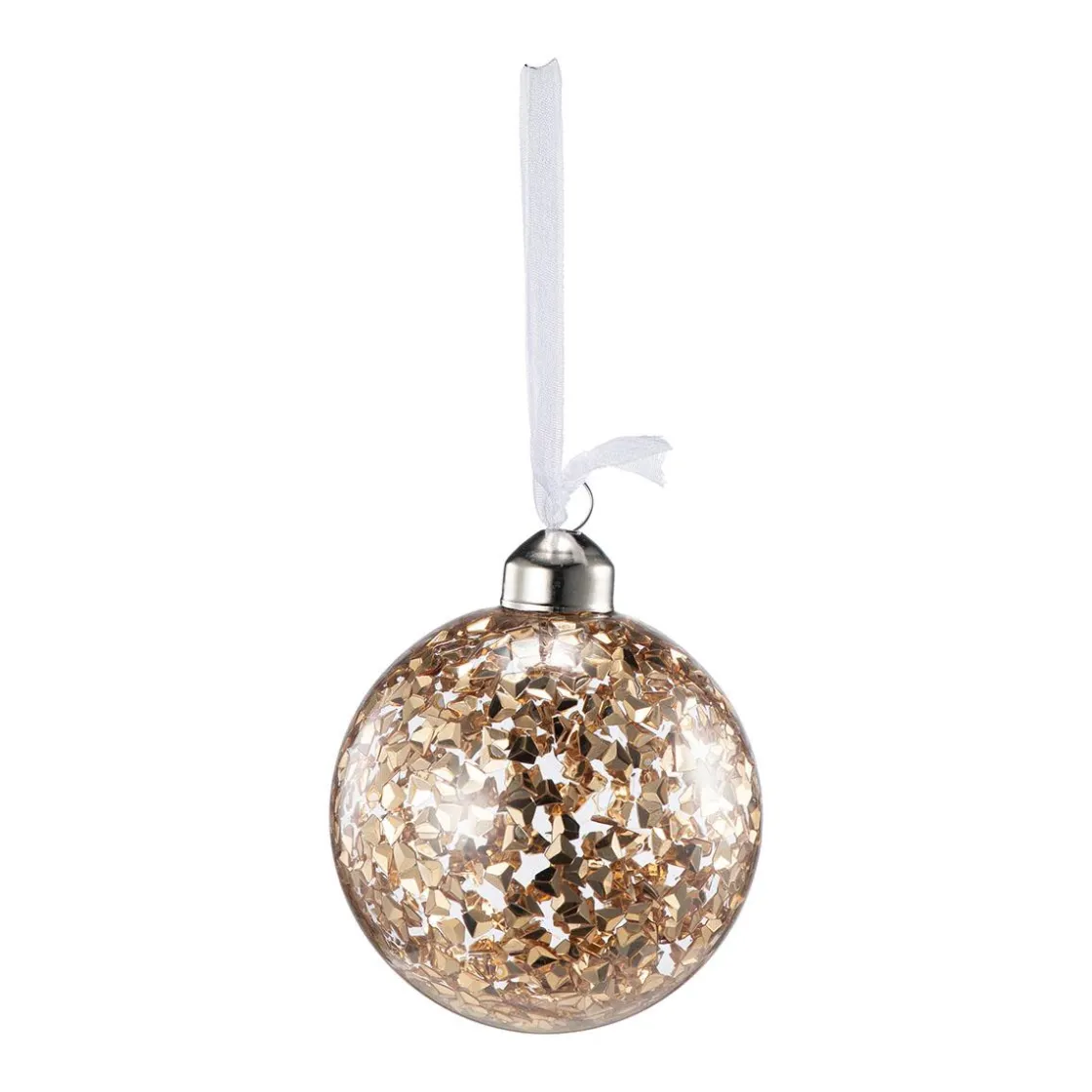 Juletrekule i klart glass fylt med glitrende gullflak som fanger lyset og skaper ekstra stemning på treet. Det transparente uttrykket gjør den lett å kombinere med både klassisk og moderne pynt. Se gjerne i rødt, grønt og gull for en helhetlig julelook.