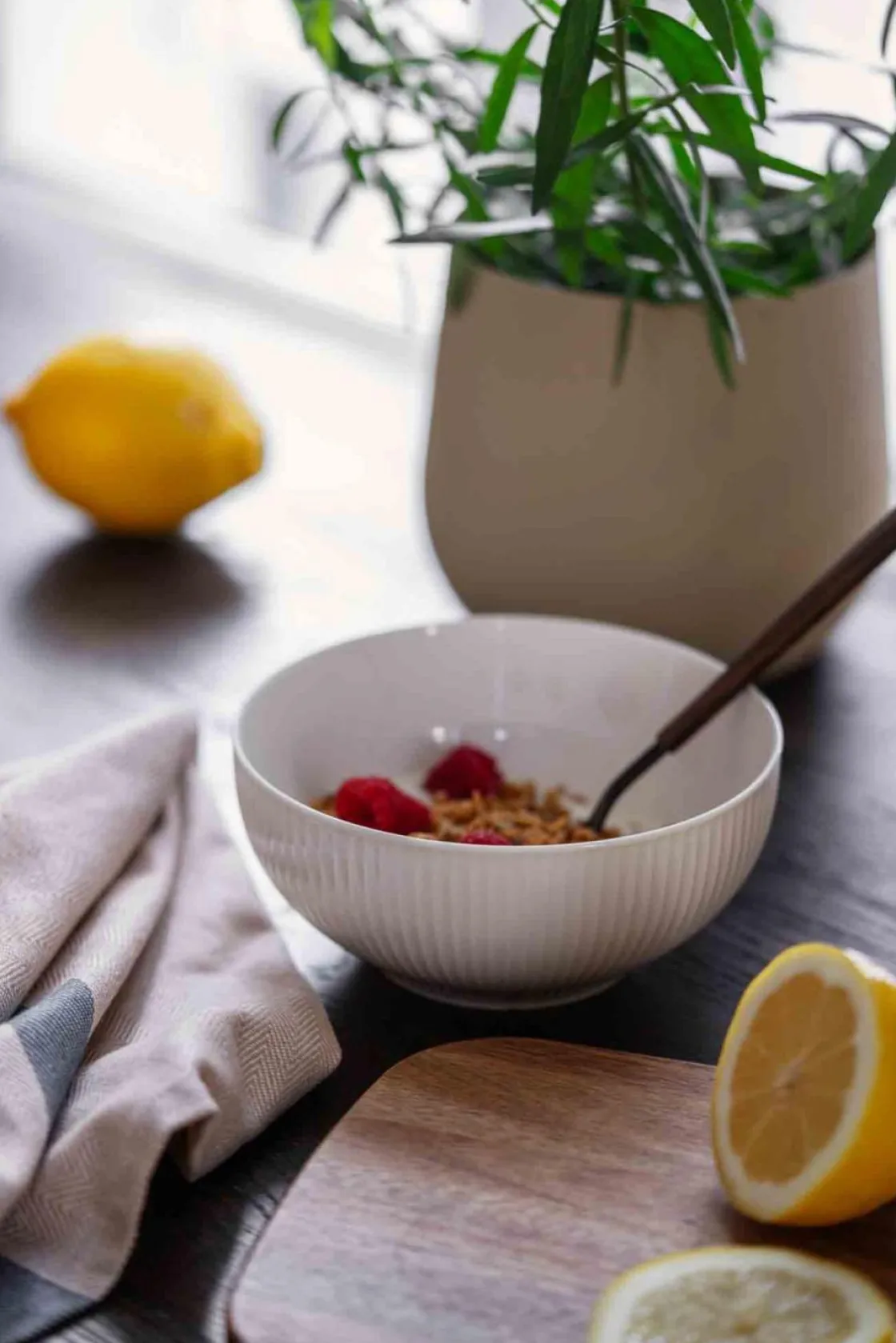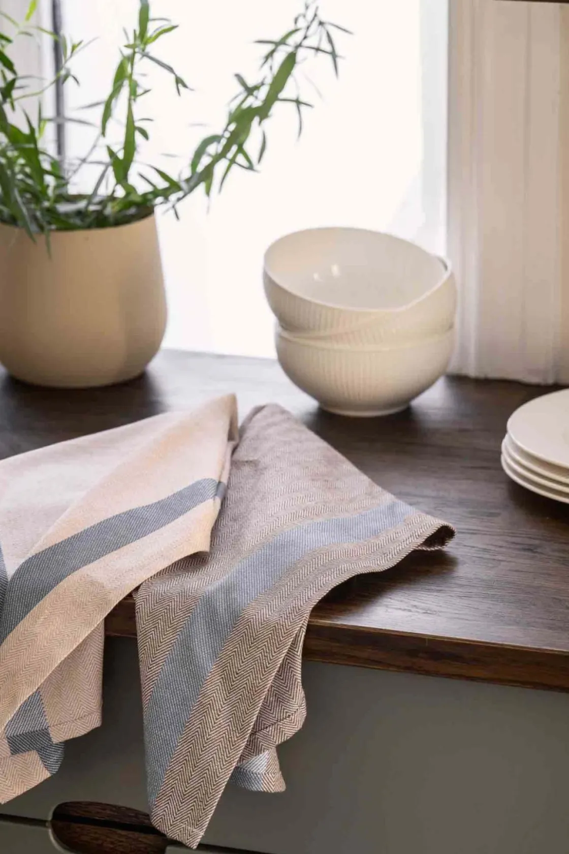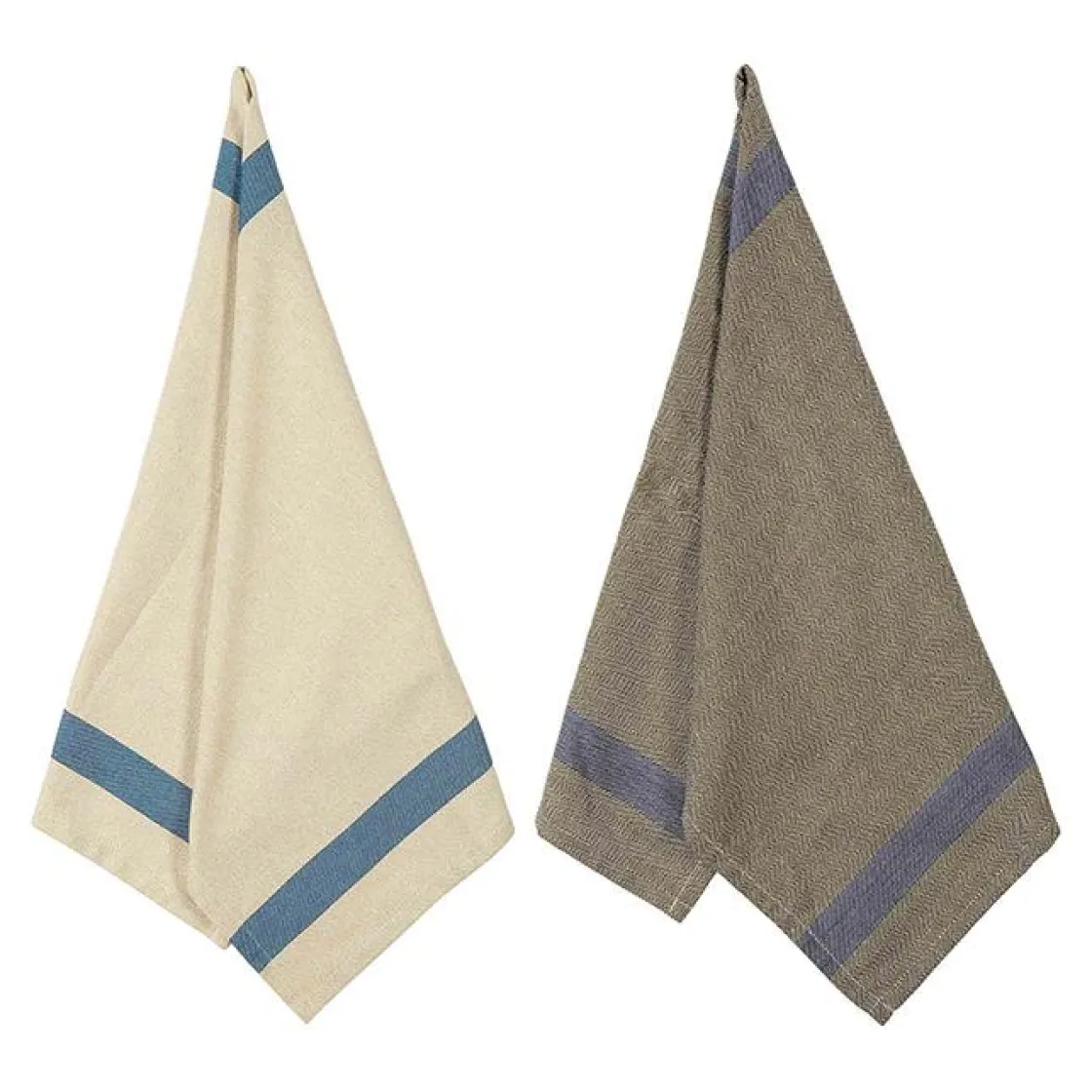 Kjøkkenhåndkleet i beige og grå med blå striper, laget av bomull. Perfekt for å tørke oppvasken og tilføre kjøkkenet ditt et friskt preg.