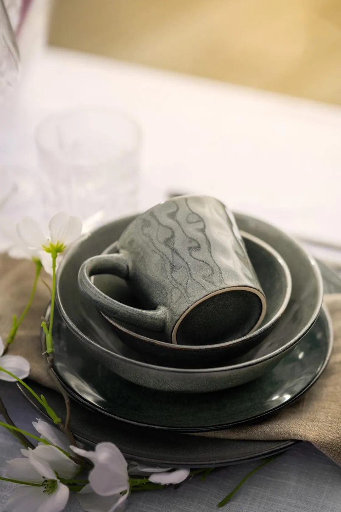 Håndlaget grønn kopp fra med et moderne og stilrent design. Steintøyet er nydelig både til hverdag og fest, og det tåler å bli brukt da det har reaktiv glasur. Vi elsker den unikheten det gir når den er håndlaget – ingen produkter er like, og gir en fantastisk stemning.