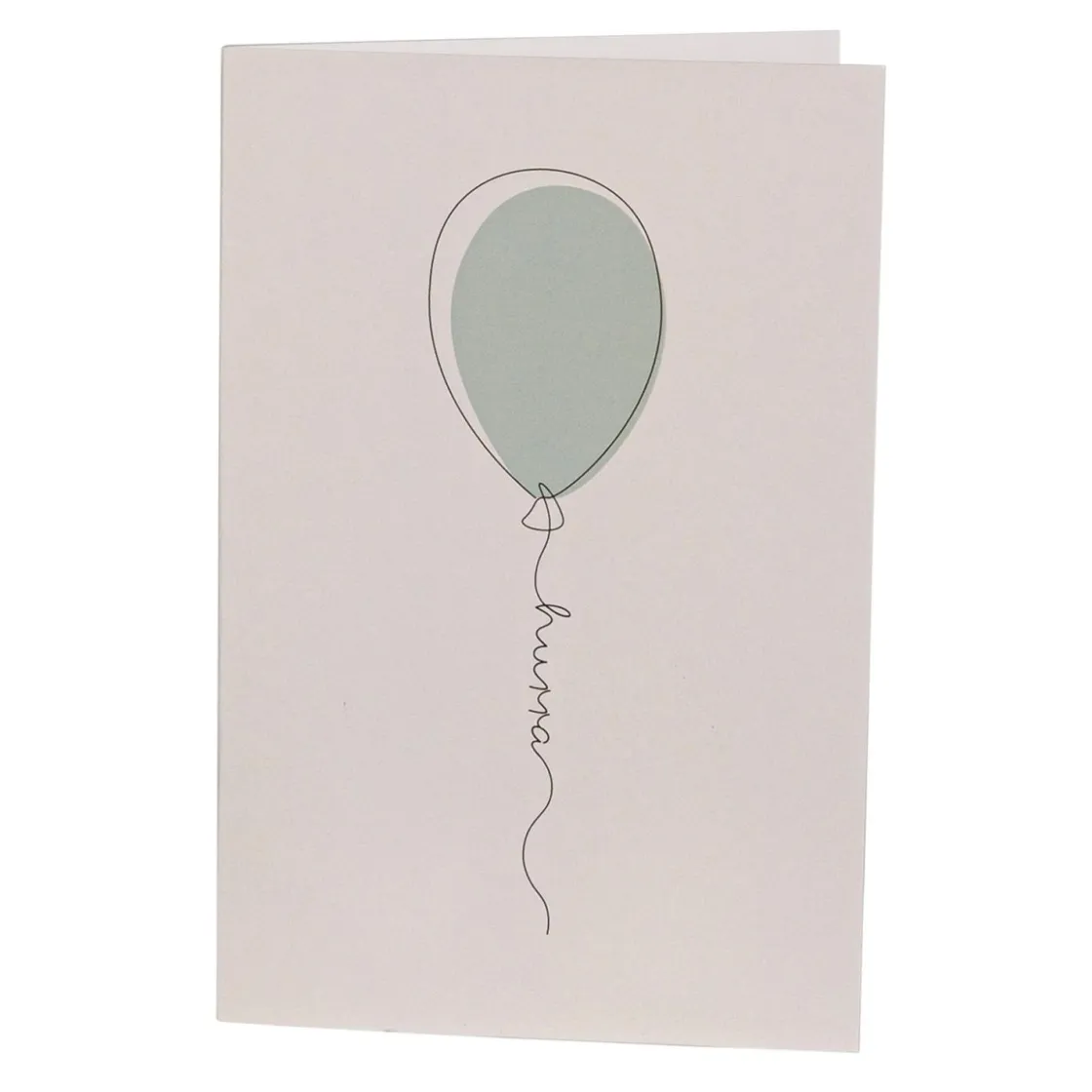 Koselig kort med en enkel grønn ballong og tekst hurra nedover i snoren. Dobbelt kort med tom innside, konvolutt inkludert.