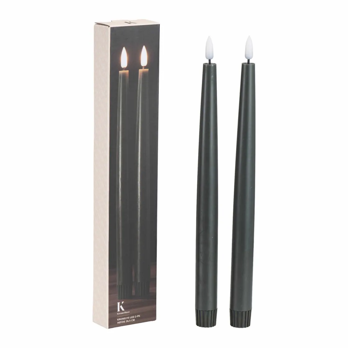 Sett med to LED kronelys i mørk grønn med naturtro flamme. Leveres i gaveeske og kan brukes med . Batteri medfølger ikke.