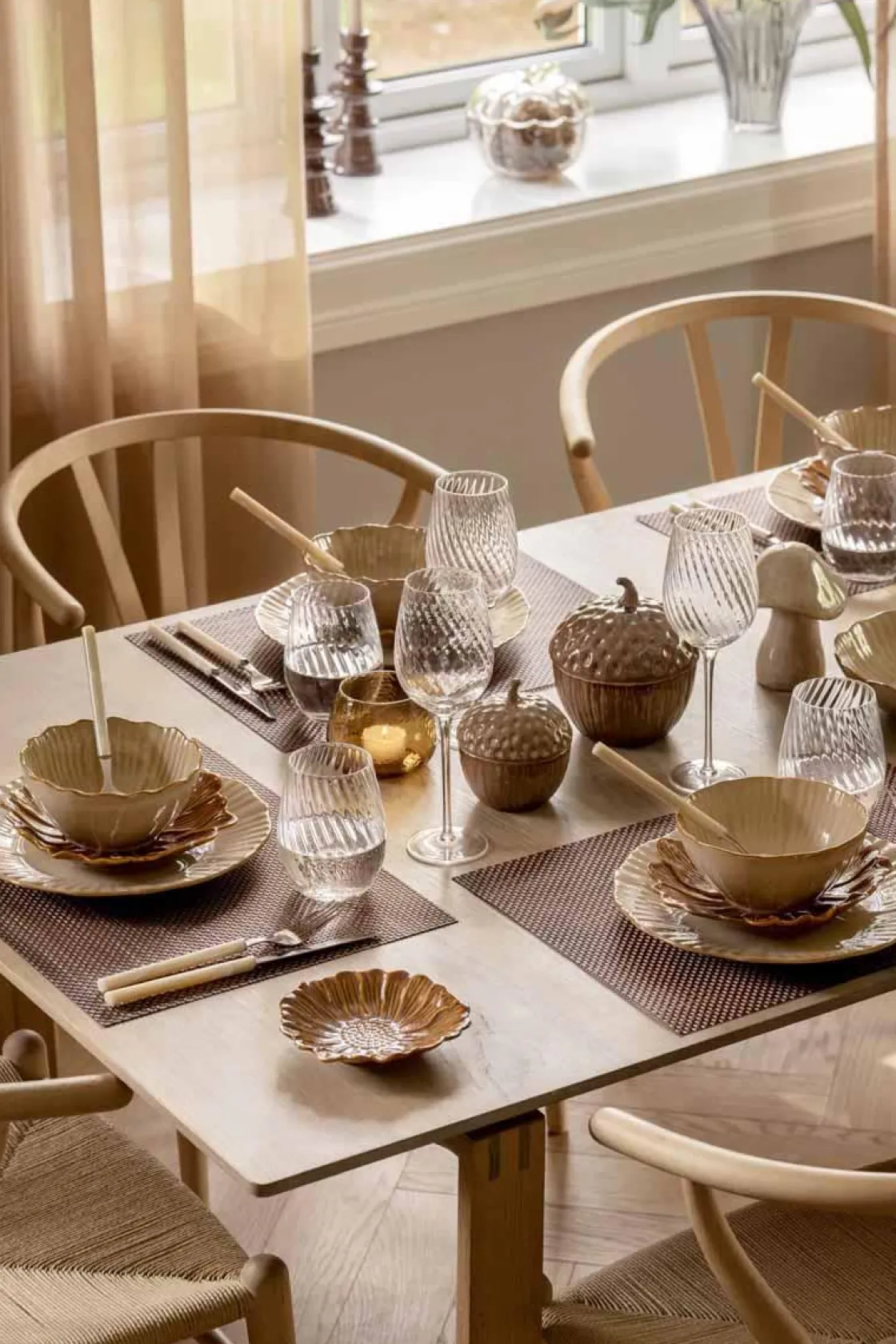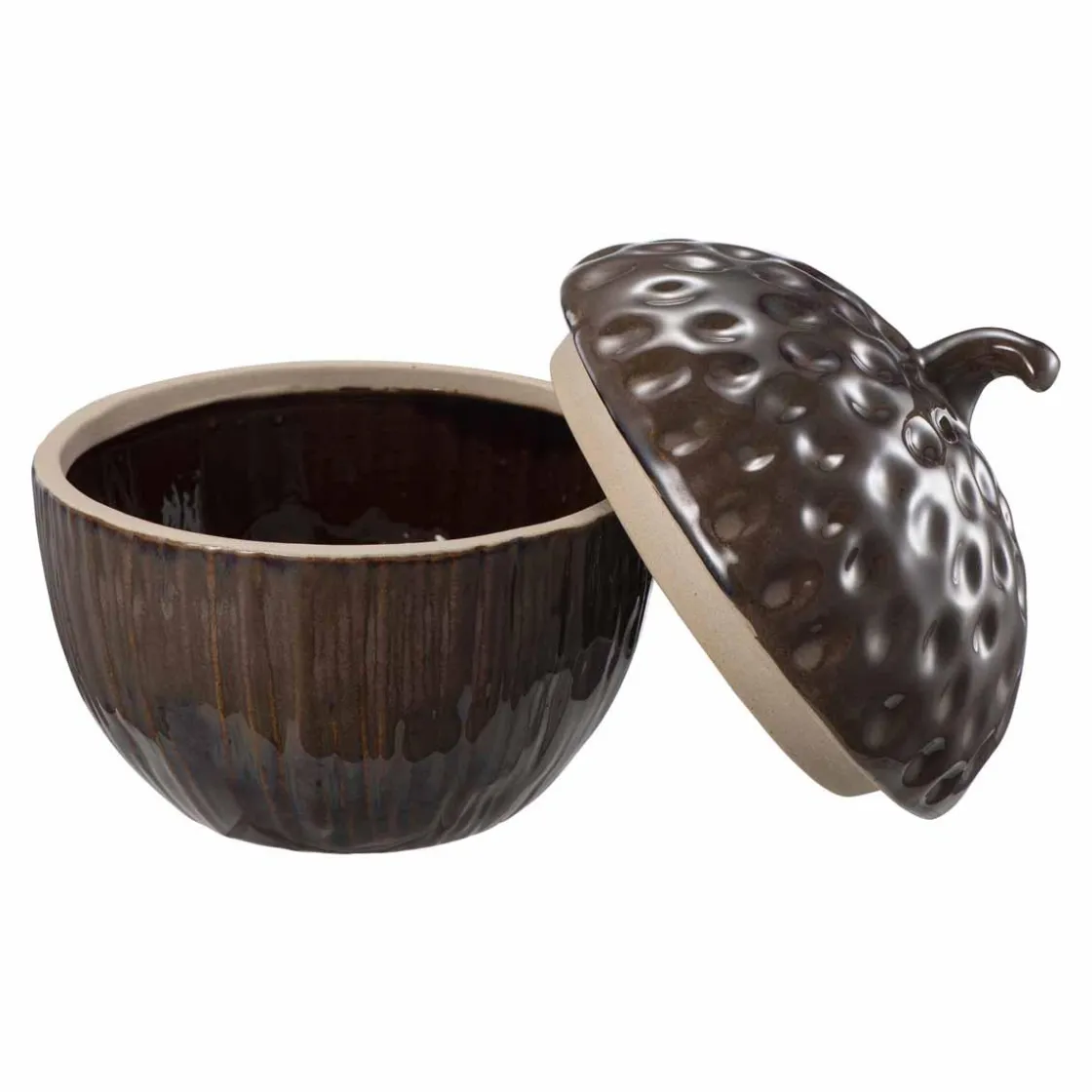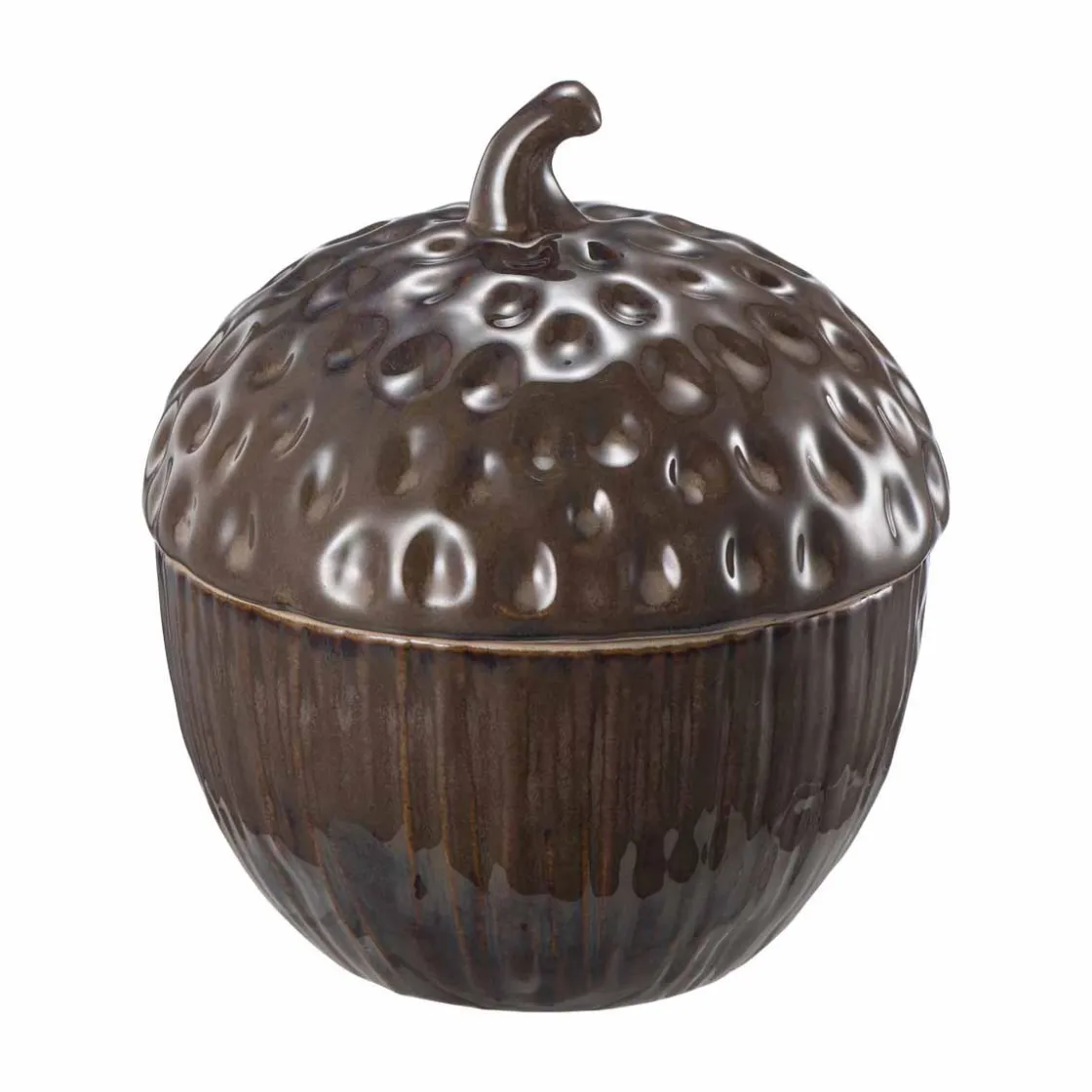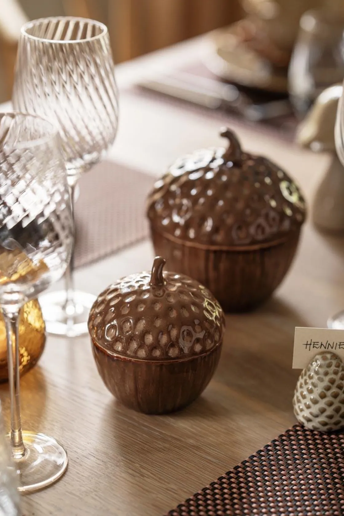 Formen er inspirert av høstens mest sjarmerende nøtt. Innsiden er glasert og godkjent for mat, så her kan du trygt oppbevare smågodt, nøtter eller noe helt annet. Den dype brunfargen gir varme til interiøret, og du finner også som passer fint ved siden av. Sammen blir de et dekorativt par. Krukken tar seg godt ut både på kjøkkenbenken og i stuen, kanskje på et mørkt med lys i ulike høyder?