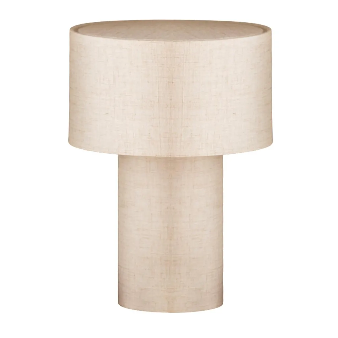 Fin bordlampe i beige, som gir behagelig lys gjennom tekstiloverflaten. Lampens form gjør seg like godt på nattbordet som i en hylle eller på et sidebord.