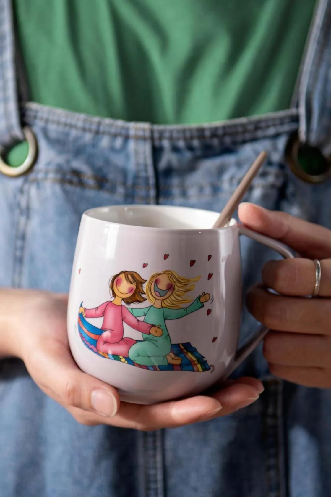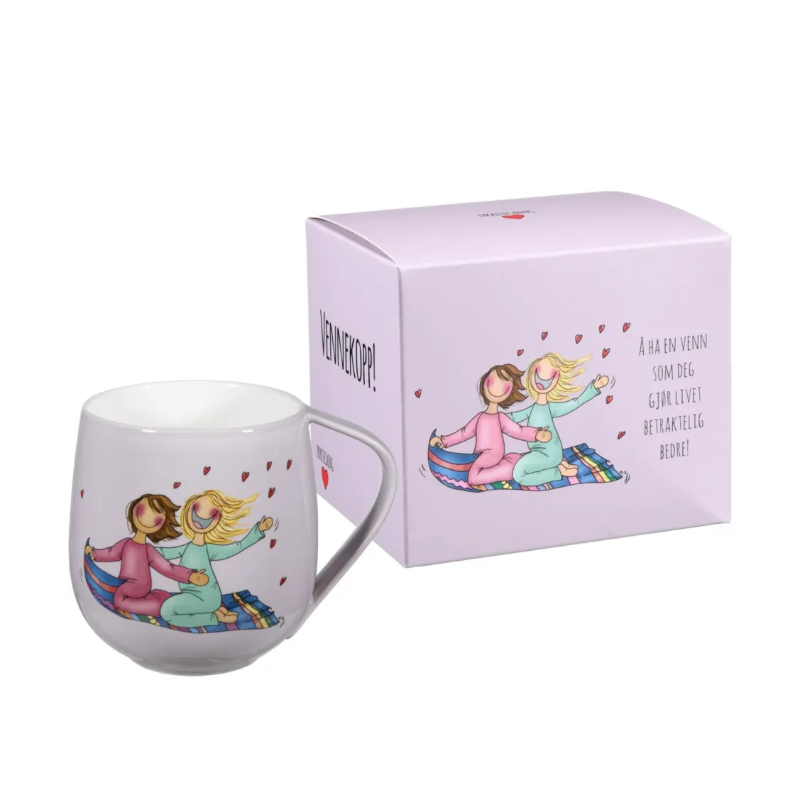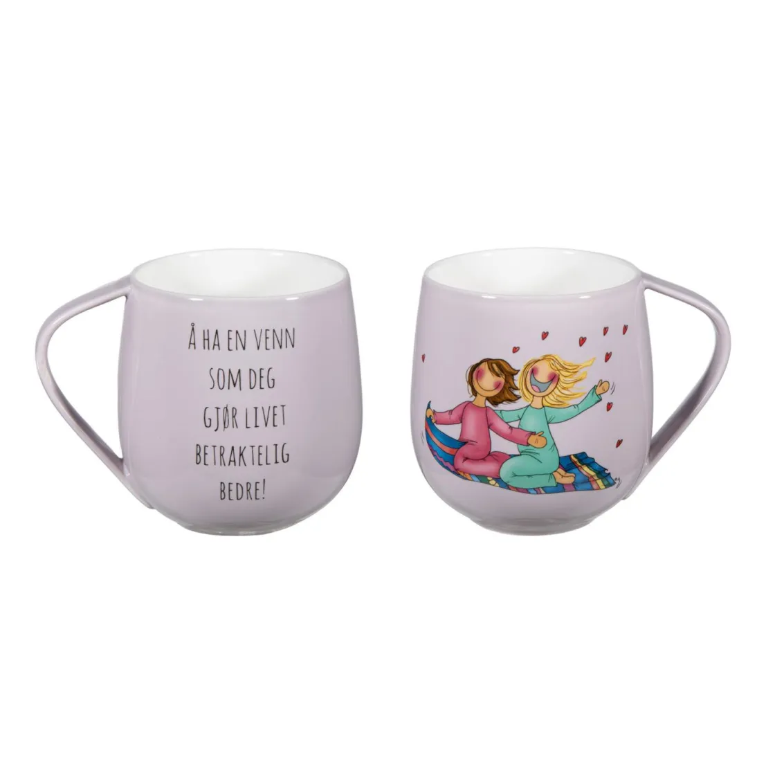 Vennekruset i lilla fra Lykketegning er en herlig måte å feire vennskap på. Dette kruset prydes av et sjarmerende motiv av to jenter som svever på et teppe, sammen med sitatet «Å ha en venn som deg gjør livet betraktelig bedre!» Det lilla designet gir en livlig og personlig touch, og gjør det til en perfekt gave for å vise hvor mye en venn betyr for deg.