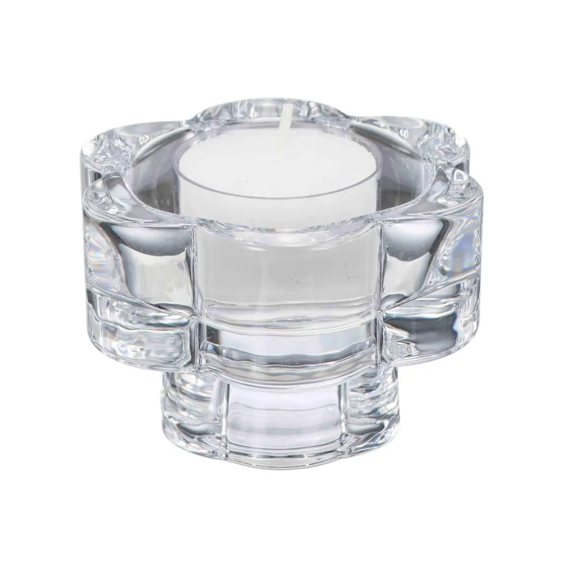 i lyset en elegant plass å skinne med denne vakre lysestaken i klart glass. Den geometriske blomsterformen gir et harmonisk uttrykk og reflekterer lyset på en måte som skaper en varm og behagelig atmosfære. Perfekt til både stearinlys og telys, denne lysestaken er ideell til å skape små, koselige øyeblikk i stuen, på spisebordet eller som en del av et dekorativt oppsett.