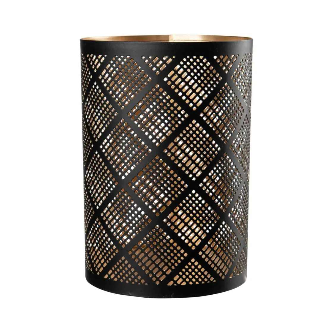 Lekker telysholder i metall, sort utenpå og gull på innsiden. Mønsteret på telysholderen skaper et varmt og vakkert spill av lys fra flammen til telyset.