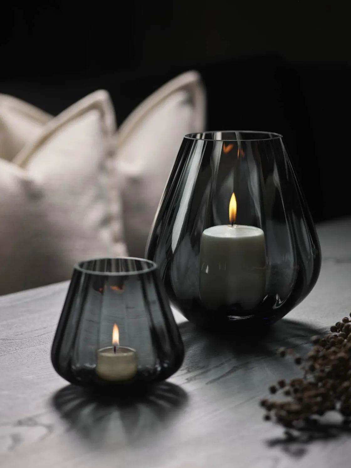 Vakker koksgrå lyslykt.. ROCKS XO-serien består av tre elegante lykter formgitt av interiørdesigneren Halvor Bakke og er tilgjengelig i 3 farger. Strukturen i formen gir et nydelig lysspill. Disse lyktene passer inn i alle interiører.