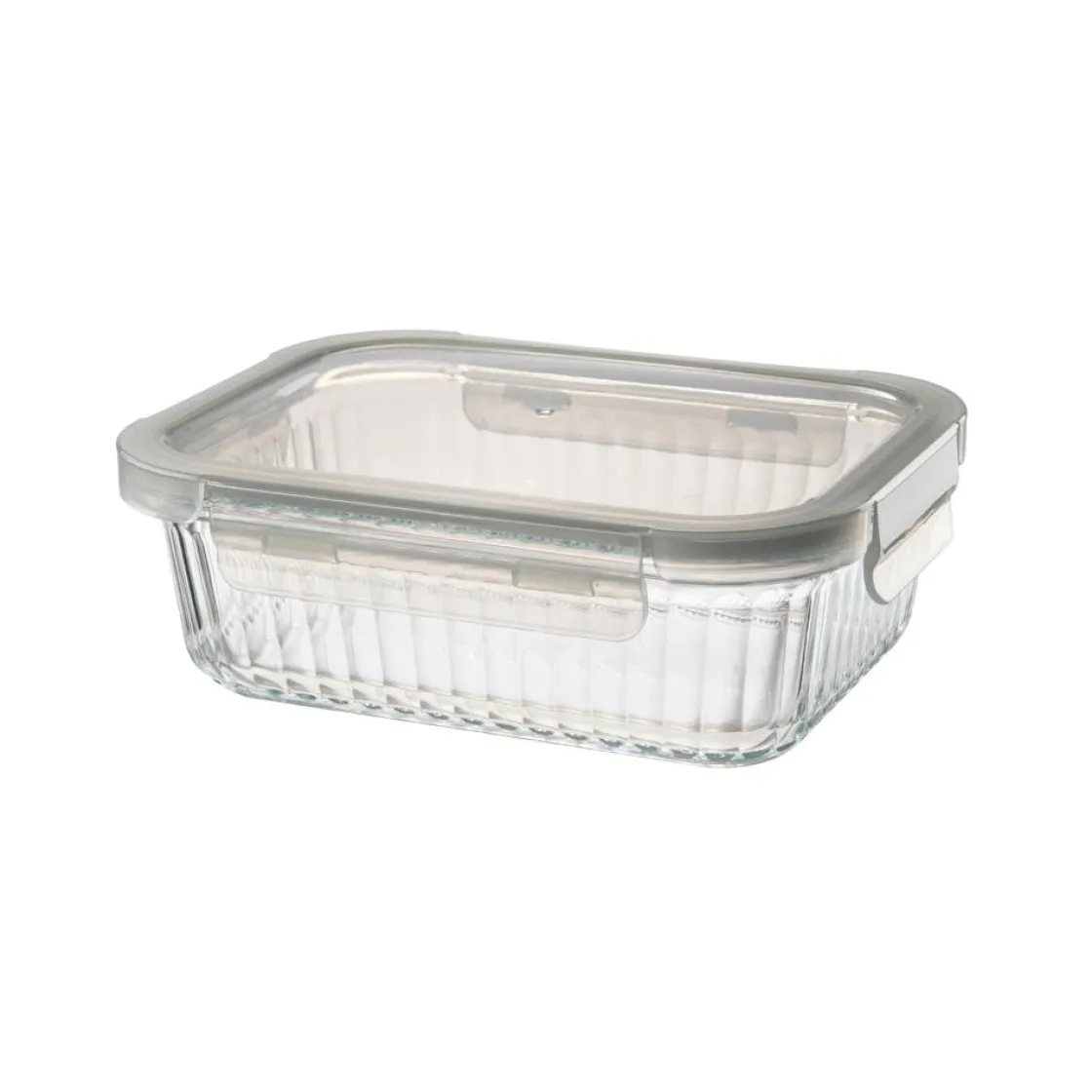 Stilig rektangulære oppbevaringsboks i borosilikatglass med lokk. Glasset har dekorative riller og er like fine til servering som til oppbevaring av mat. .