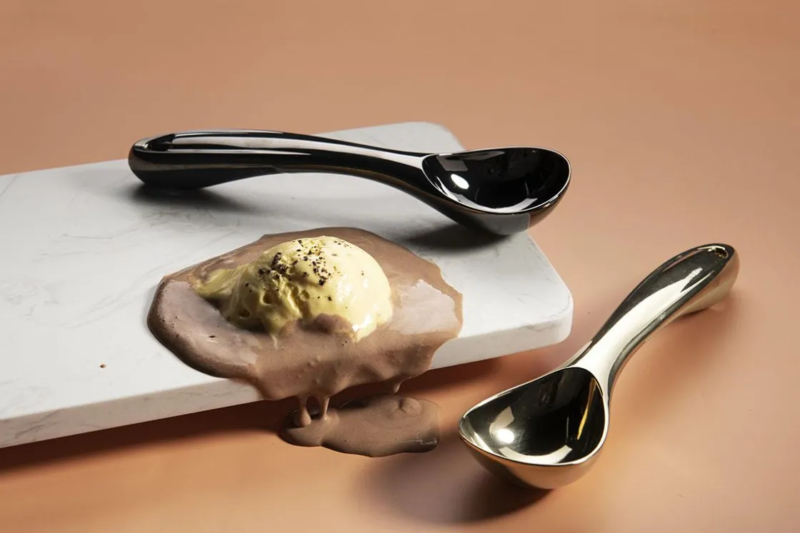 Stilfull sort isskje i forkromet stål. Isskjeen ligger komfortabelt i hånden takket være et mykt silikonlag på undersiden av håndtaket, og skjeen gir deg et godt tak på isen. Ideell for å servere is og andre desserter med stil!