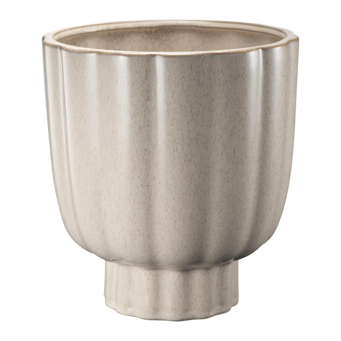 Potte Suri har en rund og rillestøpt form som gir et mykt uttrykk – litt som en blomst. Den lyse, glaserte overflaten gjør at de e får skinne.