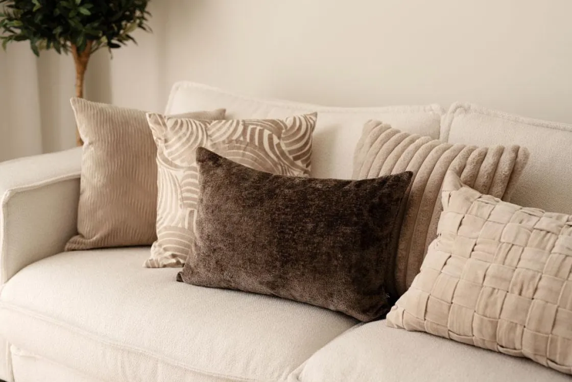 Putetrekket i nydelig brun tone gir sofaen en lun og levende tekstur. Fargen skifter litt med lyset og skaper en myk dybde i rommet – perfekt alene eller som et lunt innslag i en miks av puter. Den rektangulære formen gjør seg godt sammen med både firkantede og runde puter, og gir et balansert uttrykk i sofakroken.