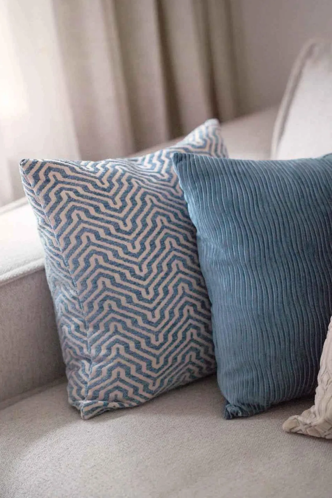 Putetrekket med geometrisk mønster i blå og beige toner gir et moderne og friskt uttrykk til stuen. Den teksturerte overflaten skaper en dynamisk kontrast, perfekt for å balansere med enklere eller ensfargede putetrekk. For en komplett sofakrok kan du kombinere med myke fløyelsputer eller nøytrale linputer som rammer inn mønsteret på en elegant måte. Legg til et og noen e for en stemningsfull atmosfære.