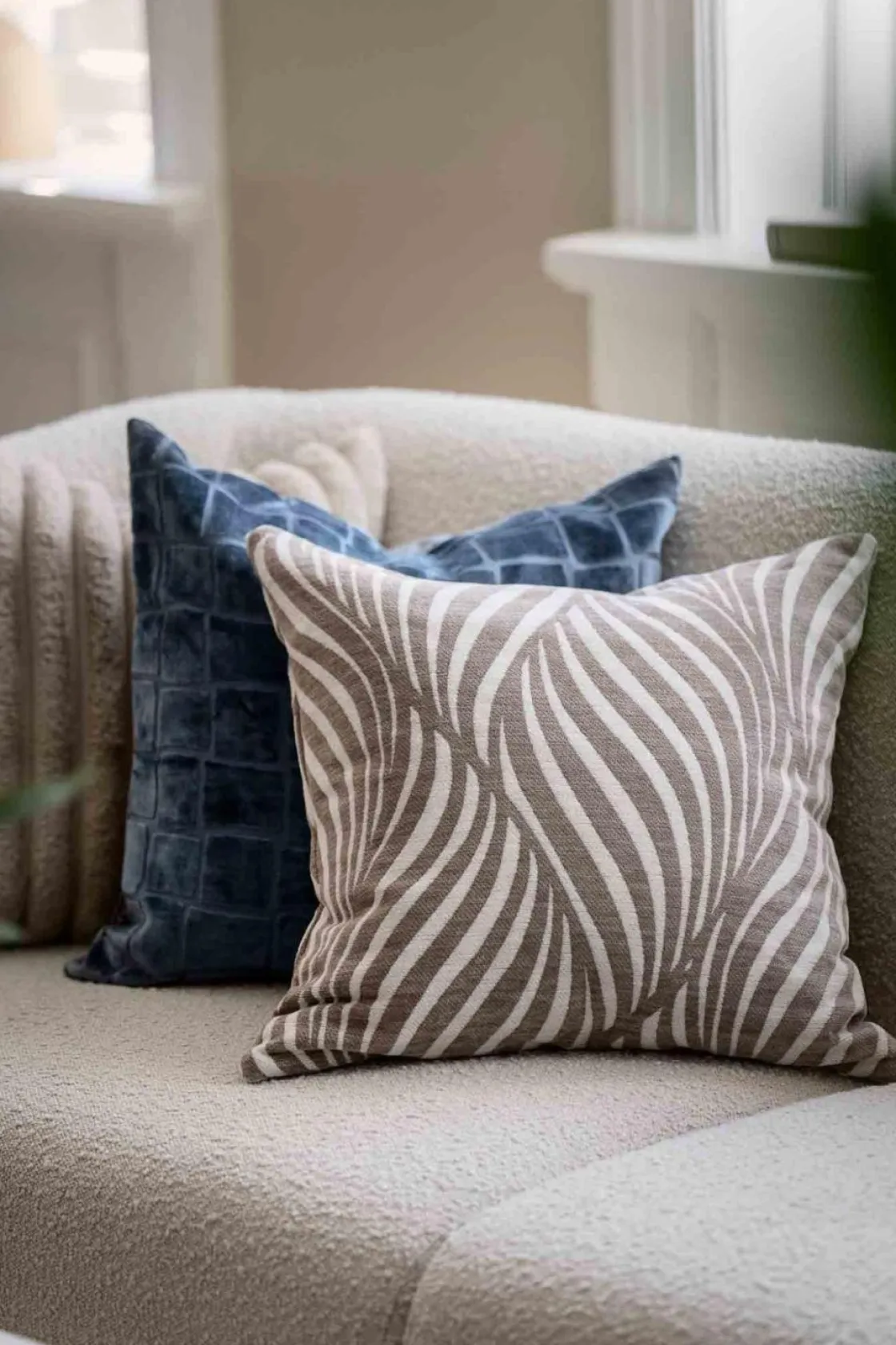 Et trendy putetrekk i velur med tekstur og markerte linjer i firkantmønster. La puten skille seg ut ved å kombinere den med nøytrale puter, eller sett den sammen med farger som harmonerer godt.
