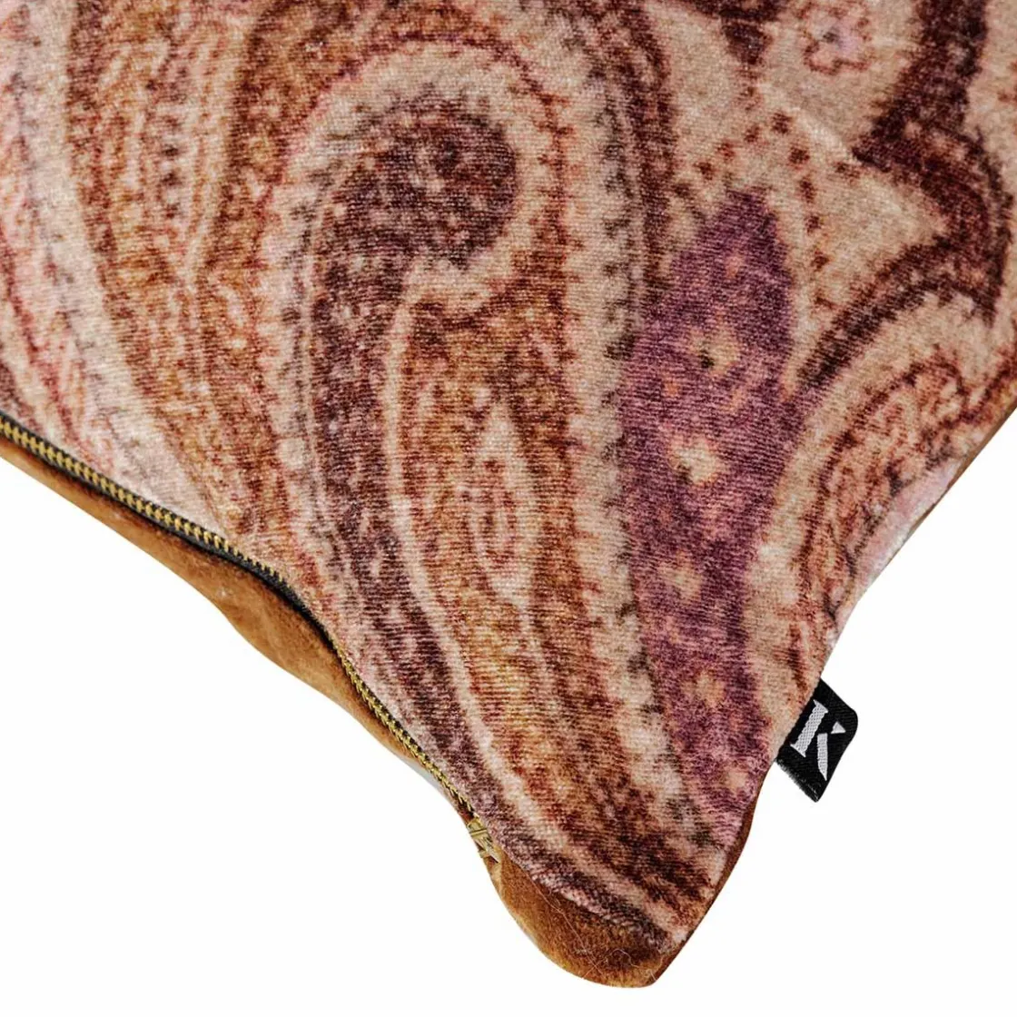 Velur pute med paisley mønster. Fargene går i rolig rosa og brunt, og gir puten et varmt uttrykk som passer ekstra godt til sesongen. Kombiner gjerne med flere i velur, eller miks inn andre teksturer som lin og bomull.