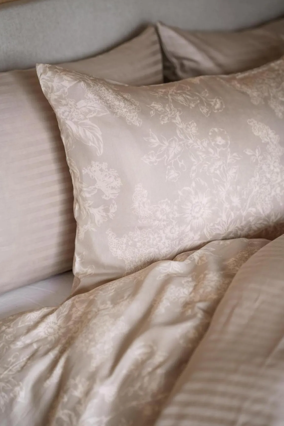 Dette sengesettet har et tidløst blomstermønster i en rolig, nøytral farge. Settet består av dynetrekk og putetrekk som bidrar til en behagelig atmosfære på soverommet. Med sin harmoniske design passer det inn i ulike interiørstiler, samtidig som det gir en myk og komfortabel følelse når du legger deg til å sove.