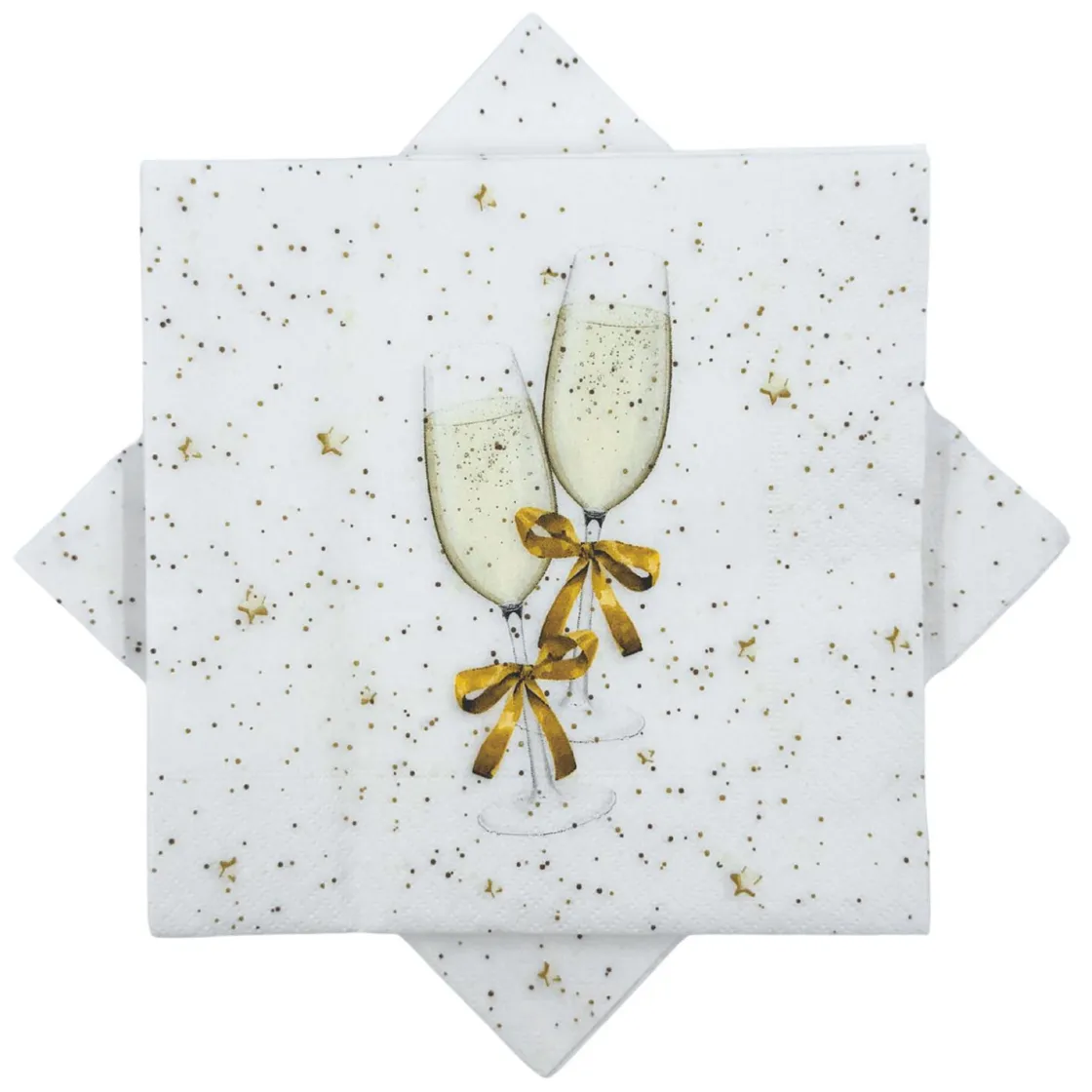 Hvit serviett med to champagneglass pyntet med gullsløyfer og stjernestrø i bakgrunnen. Et stemningsfullt innslag til nyttårsfeiringen eller festbordet.