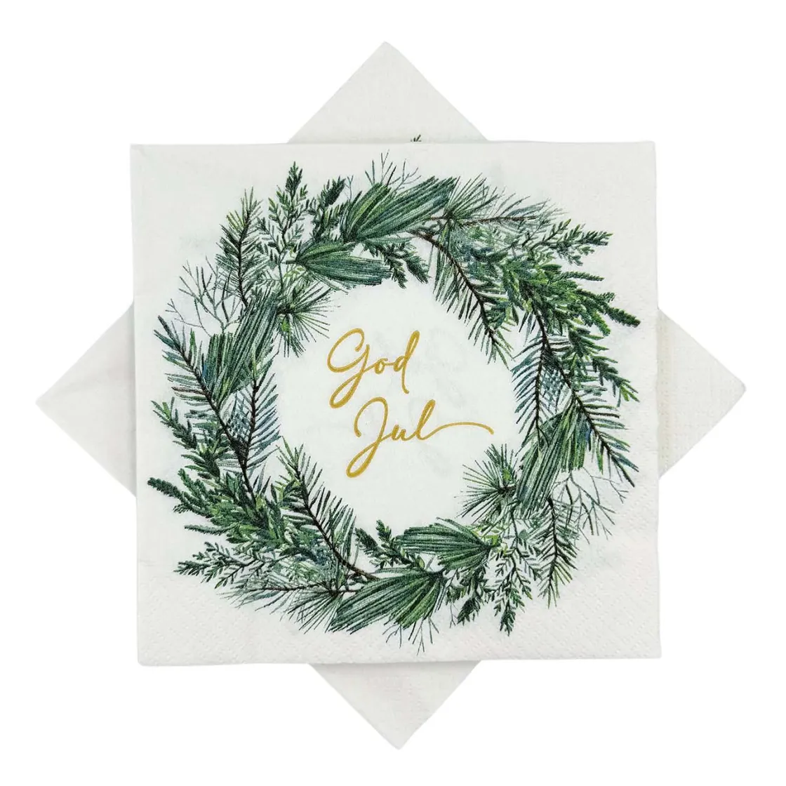 Disse serviettene har et vakkert motiv av en grønn julekrans med teksten «God Jul» i midten. Perfekte for julebordet eller andre sammenkomster i desember.