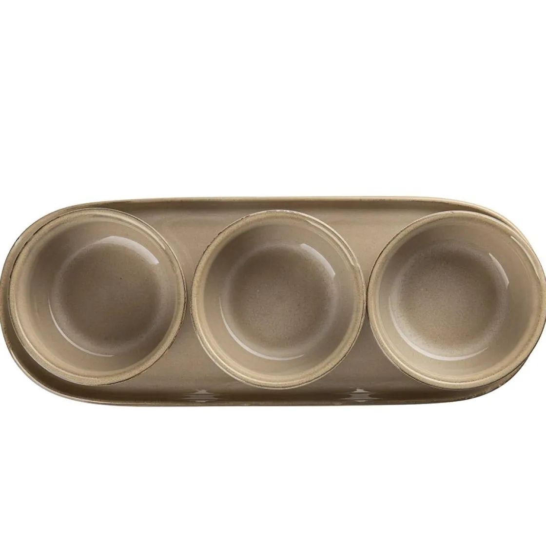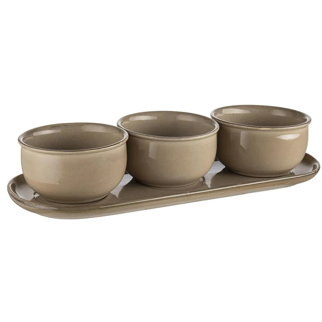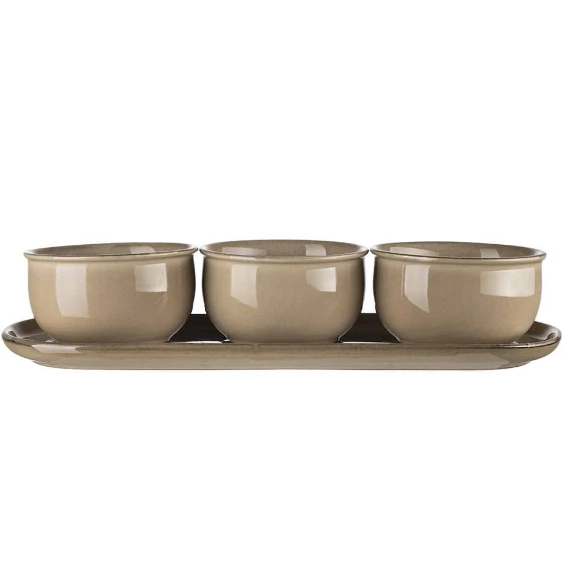 Lekkert serveringssett bestående av tre skåler i keramikk på et fat. Fin til tapas, snacks og taco, dipper og sauser. Fås også i