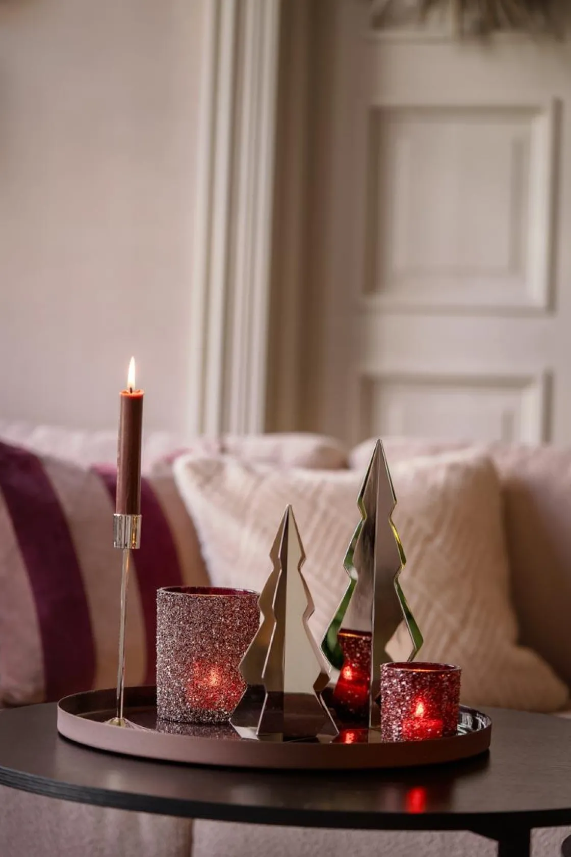 Skap deg et glittrende hjem med denne herlige telysestaken i glass med burgunderfarget glitter. Dette blir en nydelig detalj med tekstur på stuebordet, festbordet, skjenken eller lysfatet.