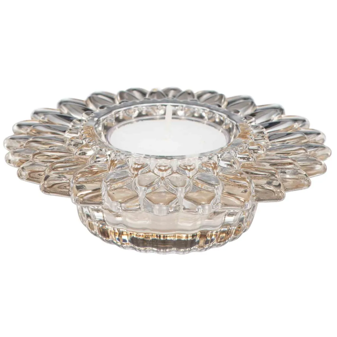 Dekorativ og lekker lysestake til telys formet som en solsikke i glass.