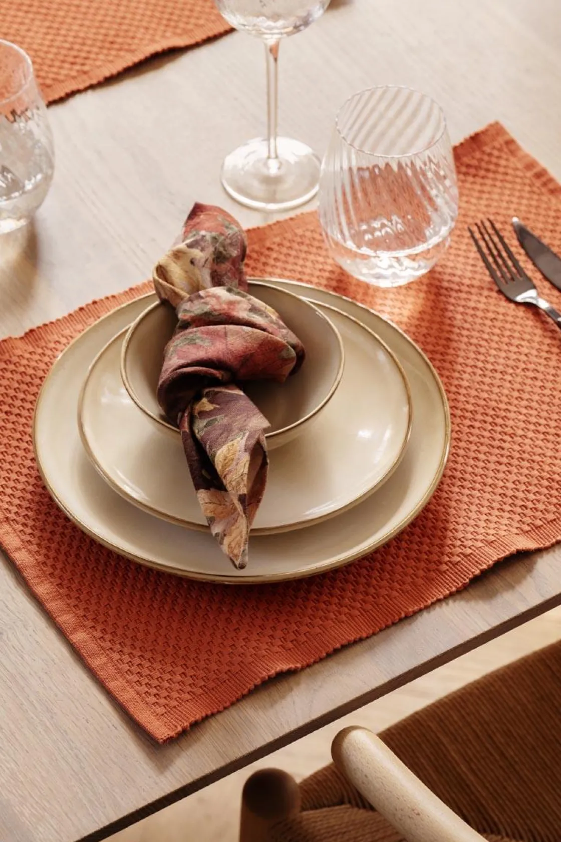 Høstbordet får en ekstra lun stemning med denne tøyservietten i dype, varme fargetoner. Stoffet har en myk struktur som gjør den både dekorativ og behagelig å bruke. Kombiner gjerne med for å skape en rolig og gjennomført helhet ved borddekkingen.