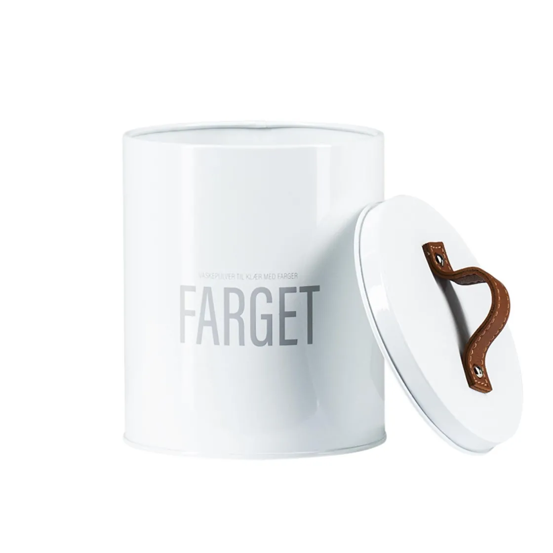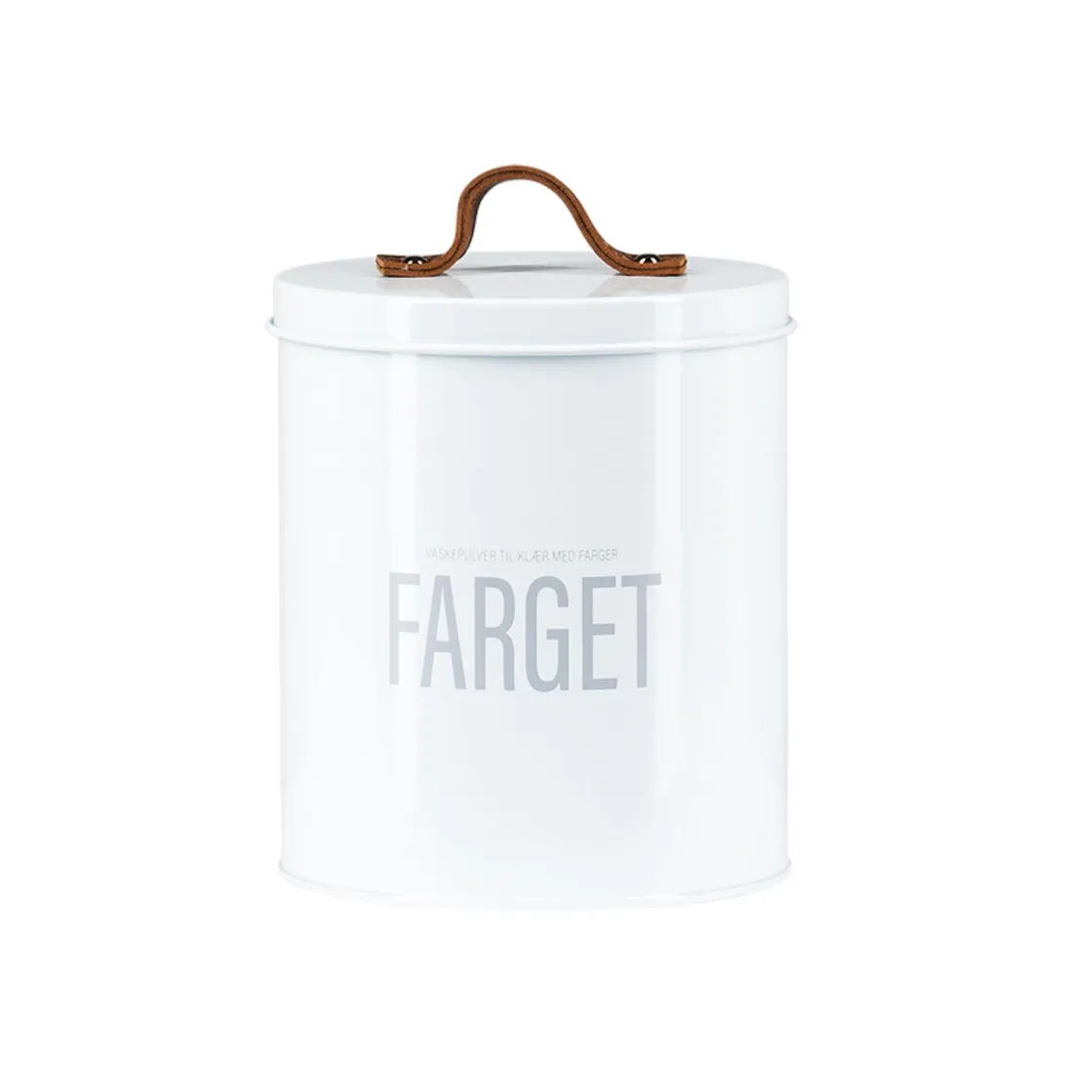 Praktisk vaskepulverboks i tidløst design. Den runde formen er tidsaktuell og lærhåndtakene gir boksen det lille ekstra. Finnes for også.