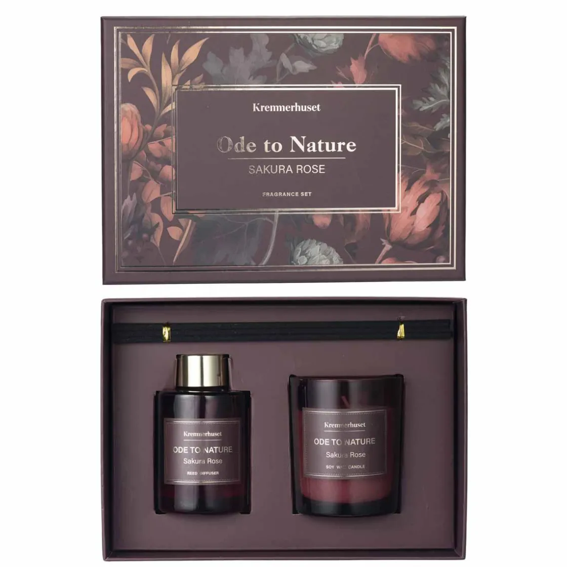 Gavesett Ode to Nature Sakura Rose har en mild og blomstrende duft som gir en frisk og behagelig atmosfære. Settet inneholder romduft og et duftlys, perfekt som gave til noen du vil gjøre litt ekstra stas på, eller som en liten hverdagsluksus til deg selv.