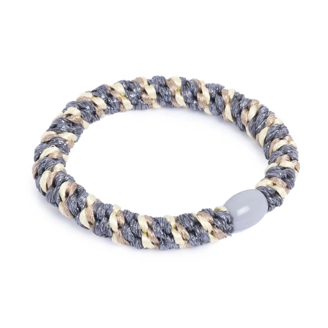 Hårstrikk med glitter i grå, beige og gul, designet med god stretch som gir en sikker og komfortabel hold, samtidig som den beskytter håret mot slitasje.