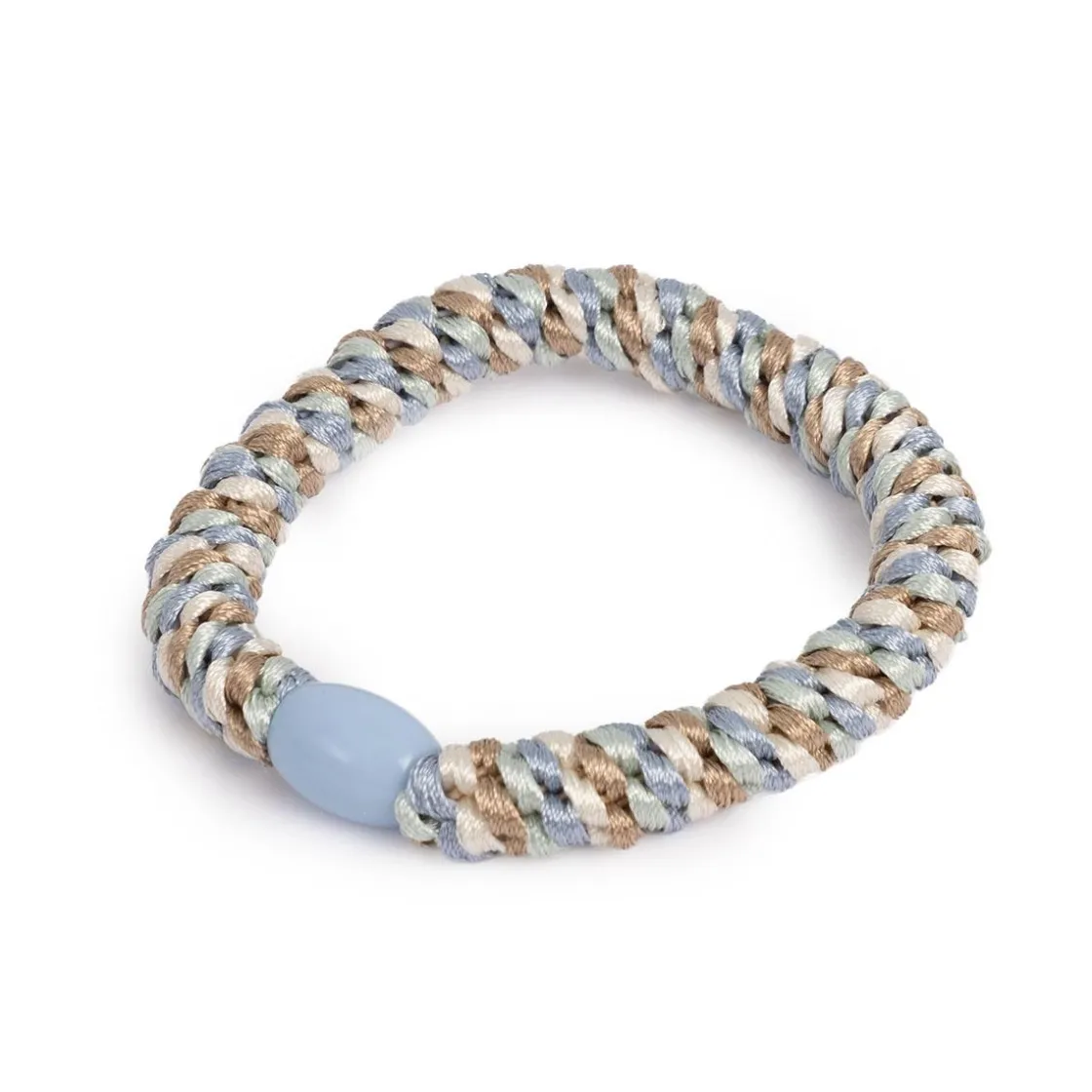 Hårstrikk Tuttifrutti i blå, beige, hvit med perle er en elegant kombinasjon av farger som gir en frisk stil til frisyren din. Denne strikken holder håret på plass og skåner det fra gnissing!