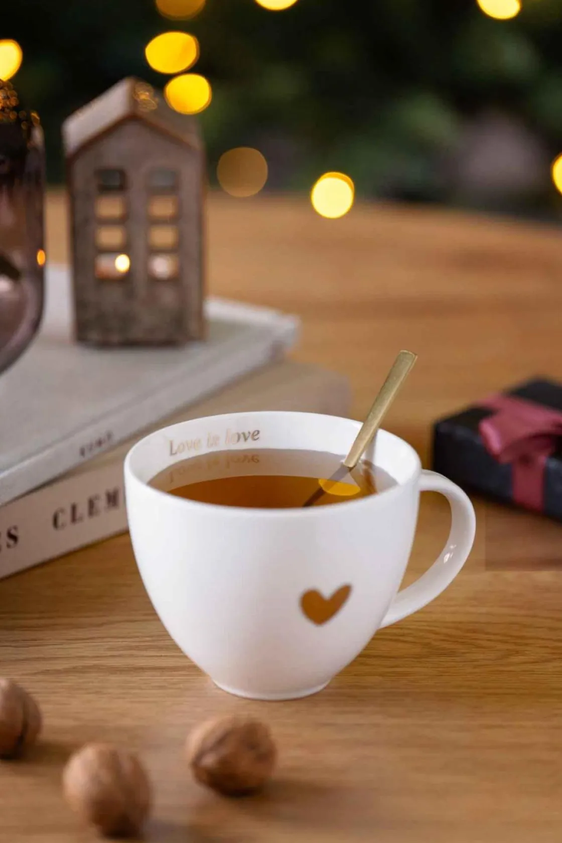 Søt kopp med gulldekor, perfekt til å dele en deilig varme drikke på kalde kvelder med din kjære. Hjerte på utsiden og tekst øverst på kanten. Love is love!