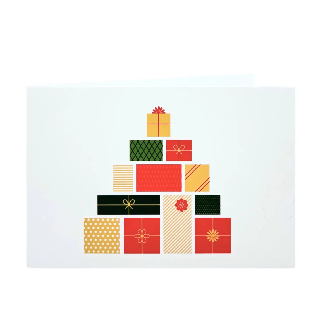 Dette julekortet viser et lekent motiv av gaver stablet som et tre, med farger som gir en varm følelse av høytid og glede. Kortet passer perfekt for å sende en hyggelig julehilsen til noen du er glad i. Det har god plass innvendig til å skrive en personlig melding, og vil garantert spre julestemning til mottakeren.