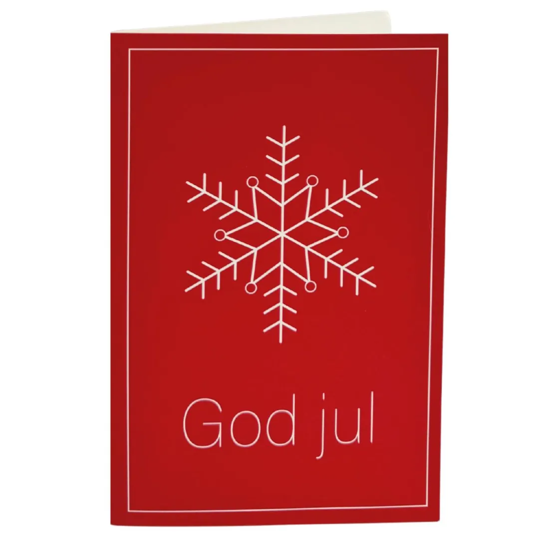 Dette julekortet har en klassisk rød bakgrunn med en hvit snøfnugg-design og teksten «God jul». Kortet passer perfekt til å sende en varm julehilsen til familie og venner. Innsiden er tom, slik at du kan skrive en personlig melding og dele julegleden på din egen måte. Dette kortet gir deg muligheten til å gjøre julefeiringen enda mer personlig for noen du setter pris på.