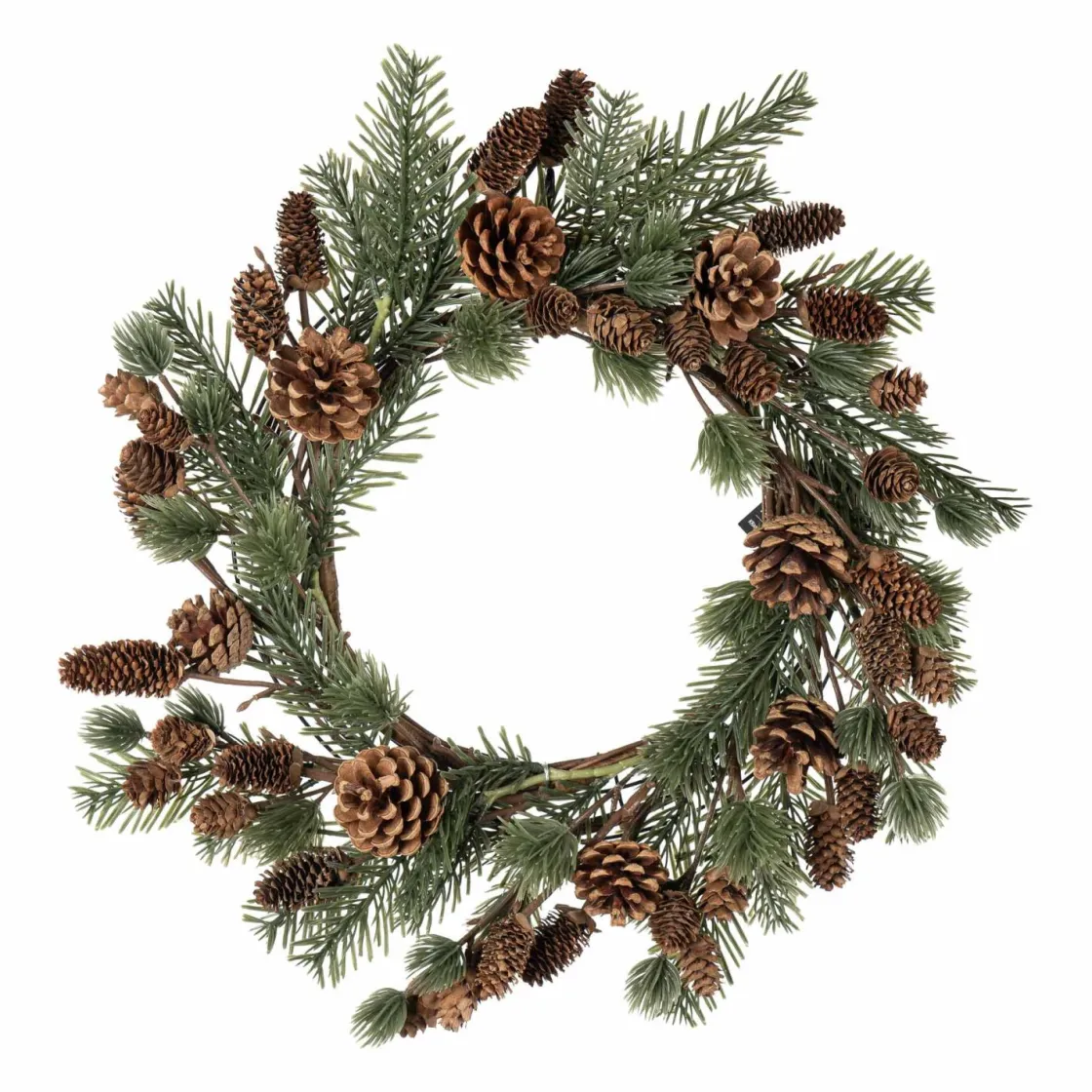 Naturtro julekrans med grønne grankvister og dekorative kongler. Fin å henge på døren, over peisen eller som midtpunkt på julebordet.