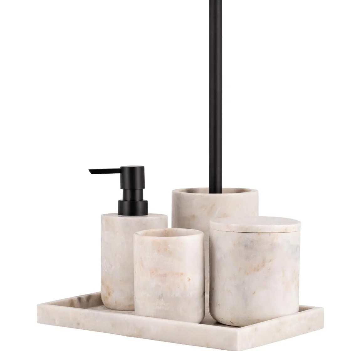 Stilig krukke med lokk i beige marmorfinish. Perfekt til å oppbevare Q-tips eller bomullspads på badet.