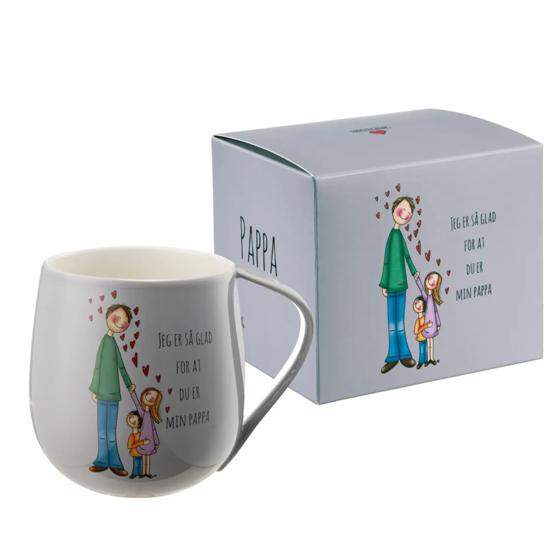 Lykketegning pappa krus i grått, med teksten «jeg er så glad for at du er min pappa». Kruset har en diameter på 9 cm, er 10 cm høyt og har en kapasitet på 40 cl. Det er laget av porselen og tåler oppvaskmaskin. Hvert krus leveres i en fin gaveeske.