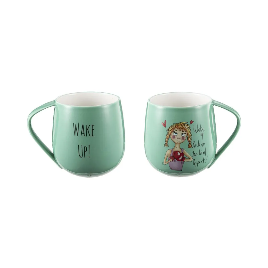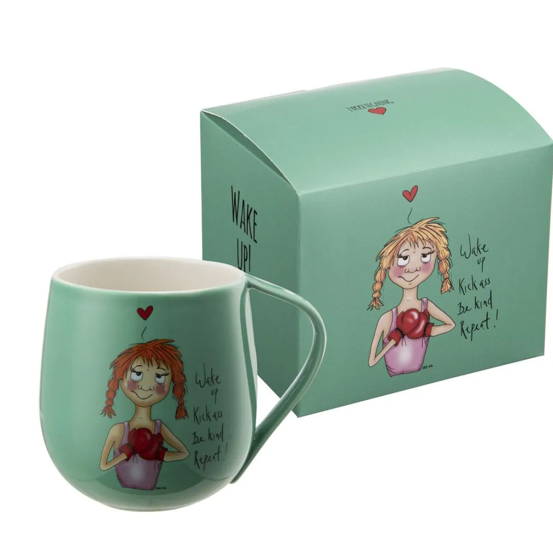 Start dagen med en boost av motivasjon med denne stilige Lykketegning-koppen! Den har den kraftfulle meldingen «Wake up. Kick ass. Be kind. Repeat!» sammen med en sjarmerende illustrasjon som gir deg ekstra energi til å møte dagen. Den myke, avrundede formen gjør koppen komfortabel å holde, og den er laget av slitesterkt porselen for daglig bruk. Perfekt som en gave til deg selv eller en sterk og inspirerende venn! Kommer i en flott gaveeske.
