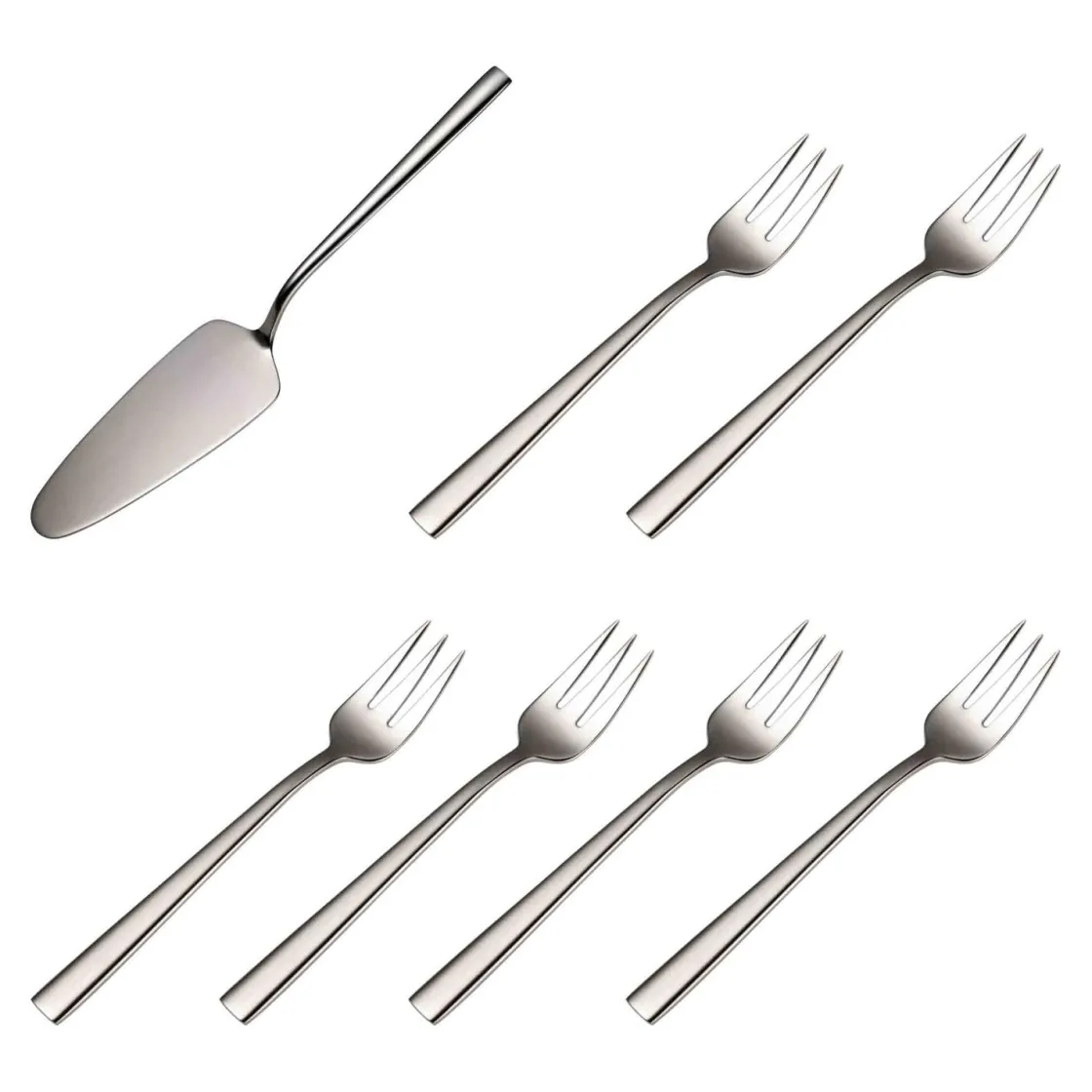 Et elegant kakesett i 18/10 rustfritt stål – en solid stålkvalitet som tåler både fest og hverdag. Inneholder én kakespade og seks kakegafler. Tåler oppvaskmaskin, men vi anbefaler å tørke godt etter vask for lengre holdbarhet. Unngå sterke rengjøringsmidler og la ikke matrester ligge for lenge.