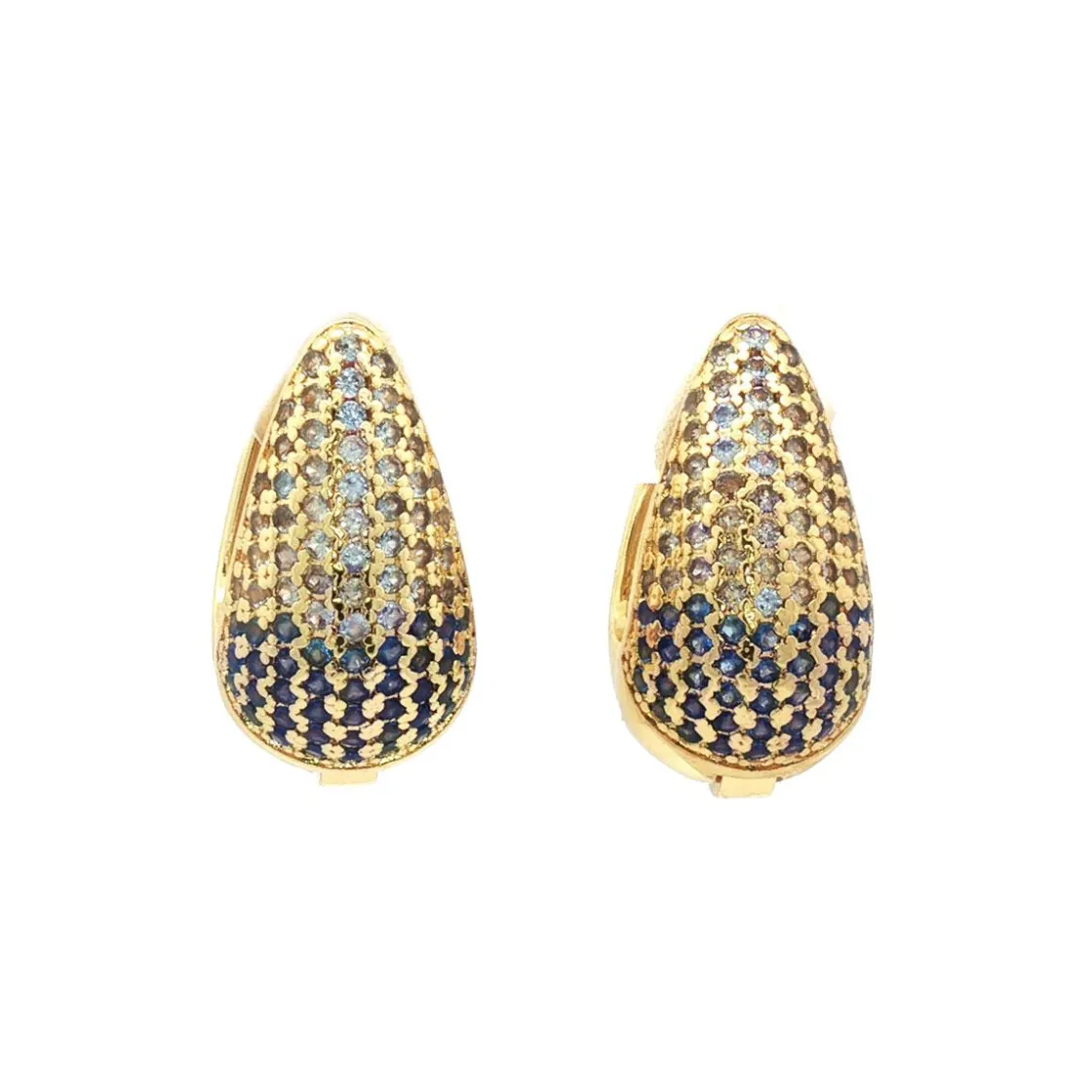 Dråpeformede øredobber i gullfarget metall med glitrende stener i blåtoner med ombre effekt. Et elegant tilskudd til både hverdagsantrekk og festlook. Kombinasjonen av blått og gull gir øredobbene et sofistikert og tidløst uttrykk.