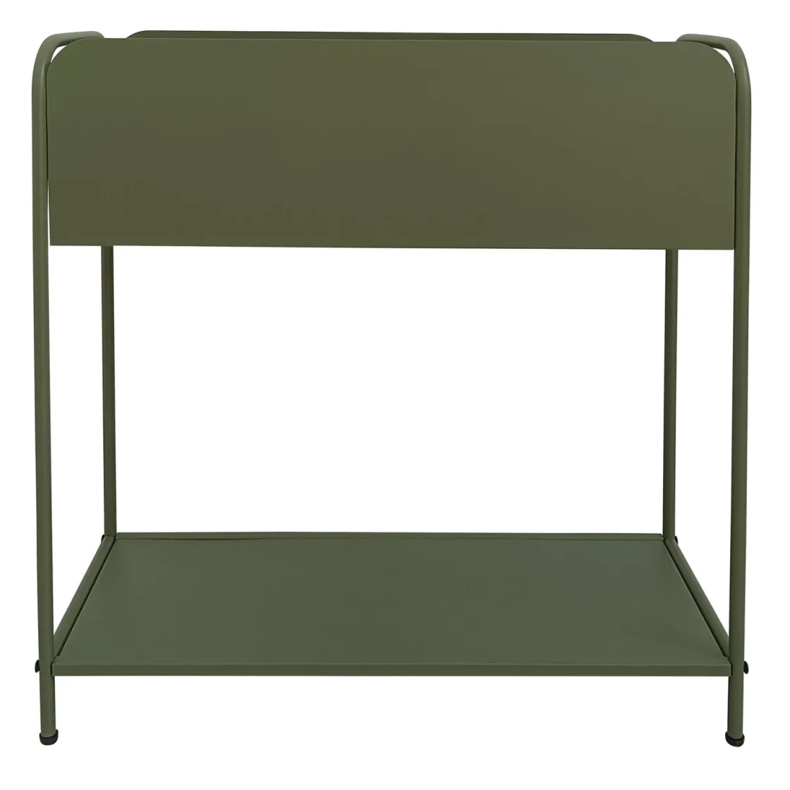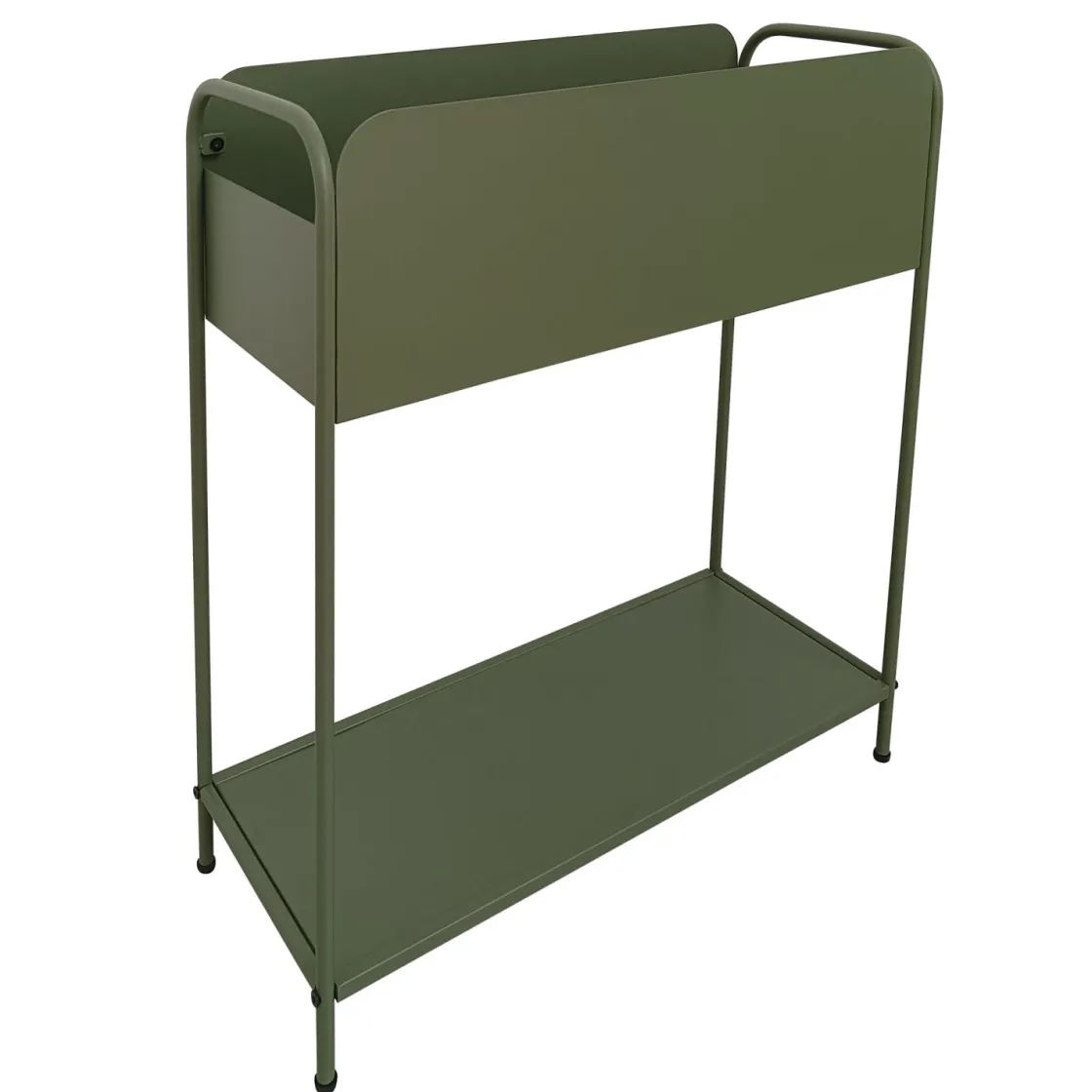 Grønn plantekasse i metall med romslig oppbevaringsplass. Perfekt til planter, magasiner, bøker eller andre småting. Passer i stua, gangen eller på balkongen.