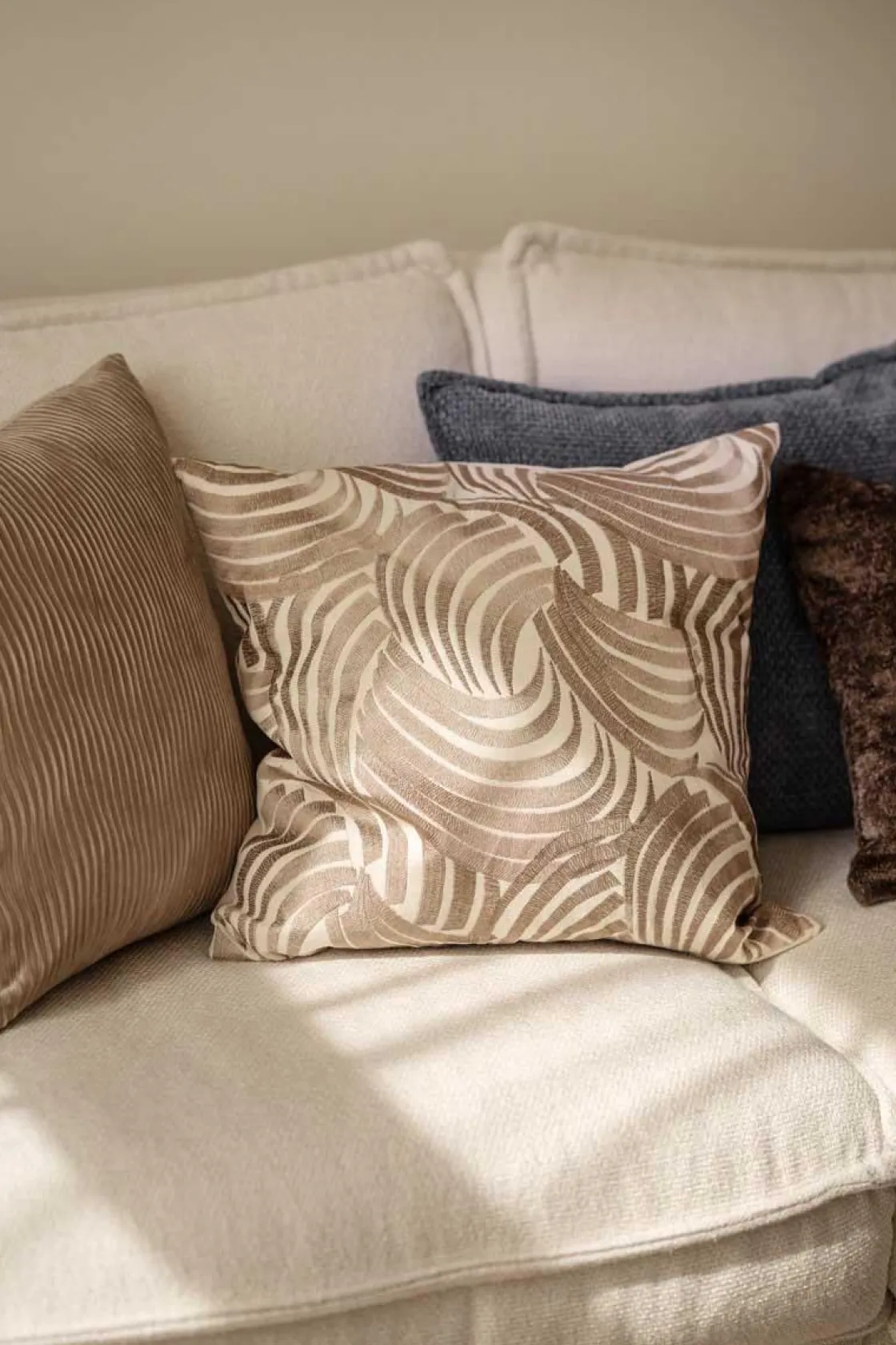 Broderte bølger i varme naturtoner gir sofakroken et løft. Mønsteret skaper liv, uten å forstyrre. Passer fint sammen med ensfargede i lin eller velur, eller mot mørkegrønn bakgrunn for en lunere stemning.