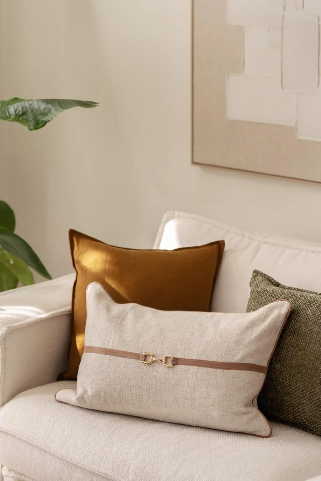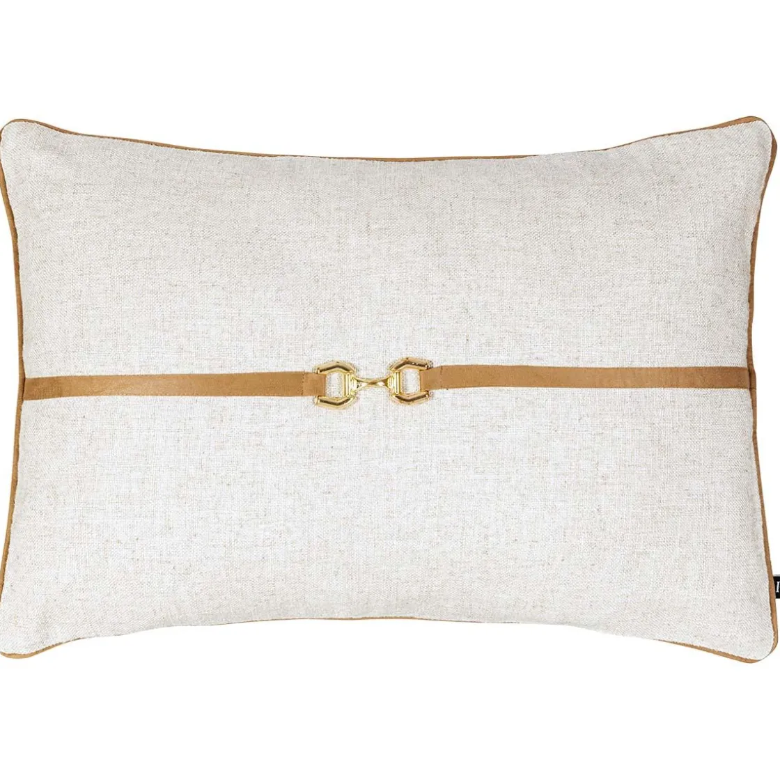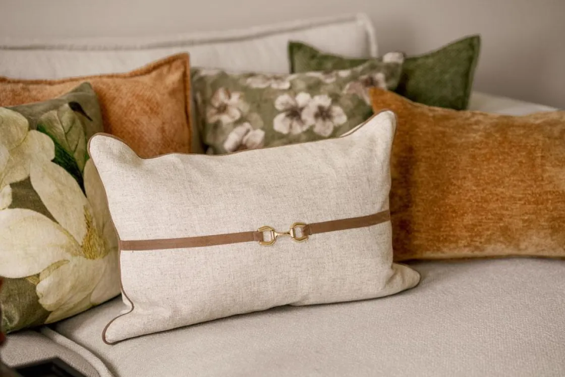 Et mykt tekstil møter en dekorativ skinndetalj med metallspenne i gull. Putetrekket har en rektangulær form som gir fin støtte i korsryggen, og passer like godt i sofaen som på en benk i gangen. Den gyldne detaljen gir en liten dose karakter – akkurat nok til å gjøre inntrykk uten å ta over. Kombiner gjerne med i ull eller velur for ekstra kontrast i materialene.