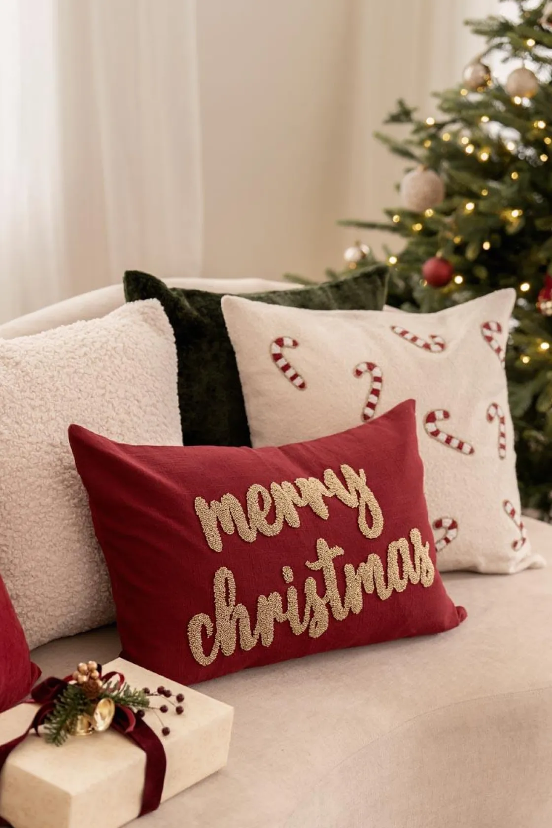 Dette putetrekket i hvitt med lekre candycanestenger og perledetaljer gir stuen et festlig og søtt julepreg. Kombiner den med andre for å skape den ultimate julestemningen!