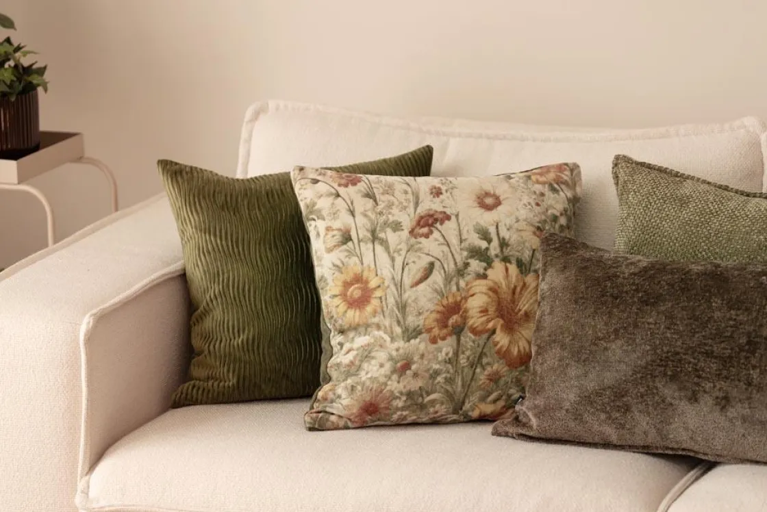 Et blomsterhav i dype gule, grønne og rusttoner gir en lun følelse gjennom hele sesongen. Putetrekket har et nostalgisk uttrykk. Kombiner gjerne med grove tekstiler, nøytrale eller velurputer i varm grønn eller brent oransje for et mykt og samstemt uttrykk i sofaen.